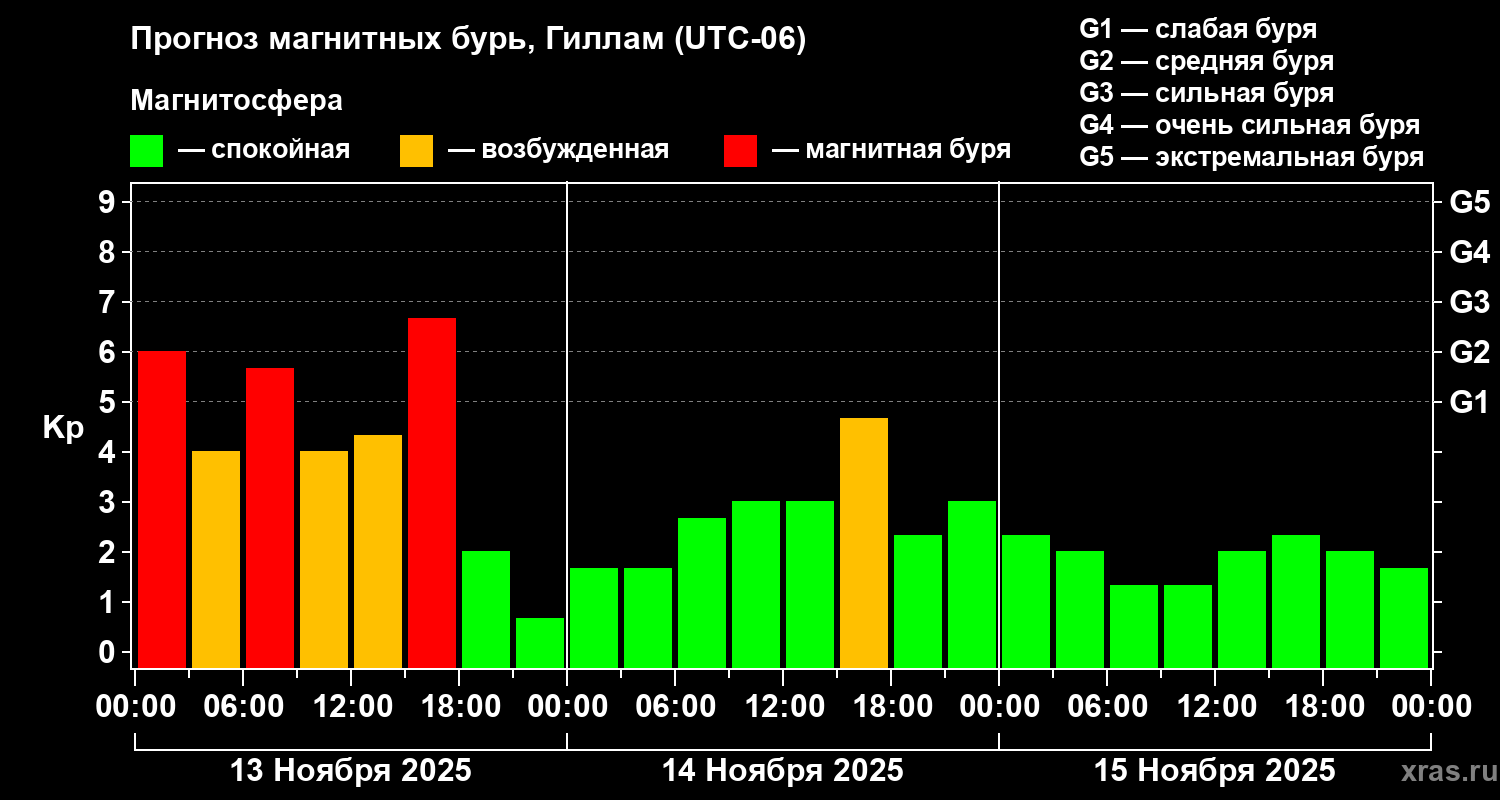 Прогноз магнитных бурь в Гилламе — 13 ноября 2025 года