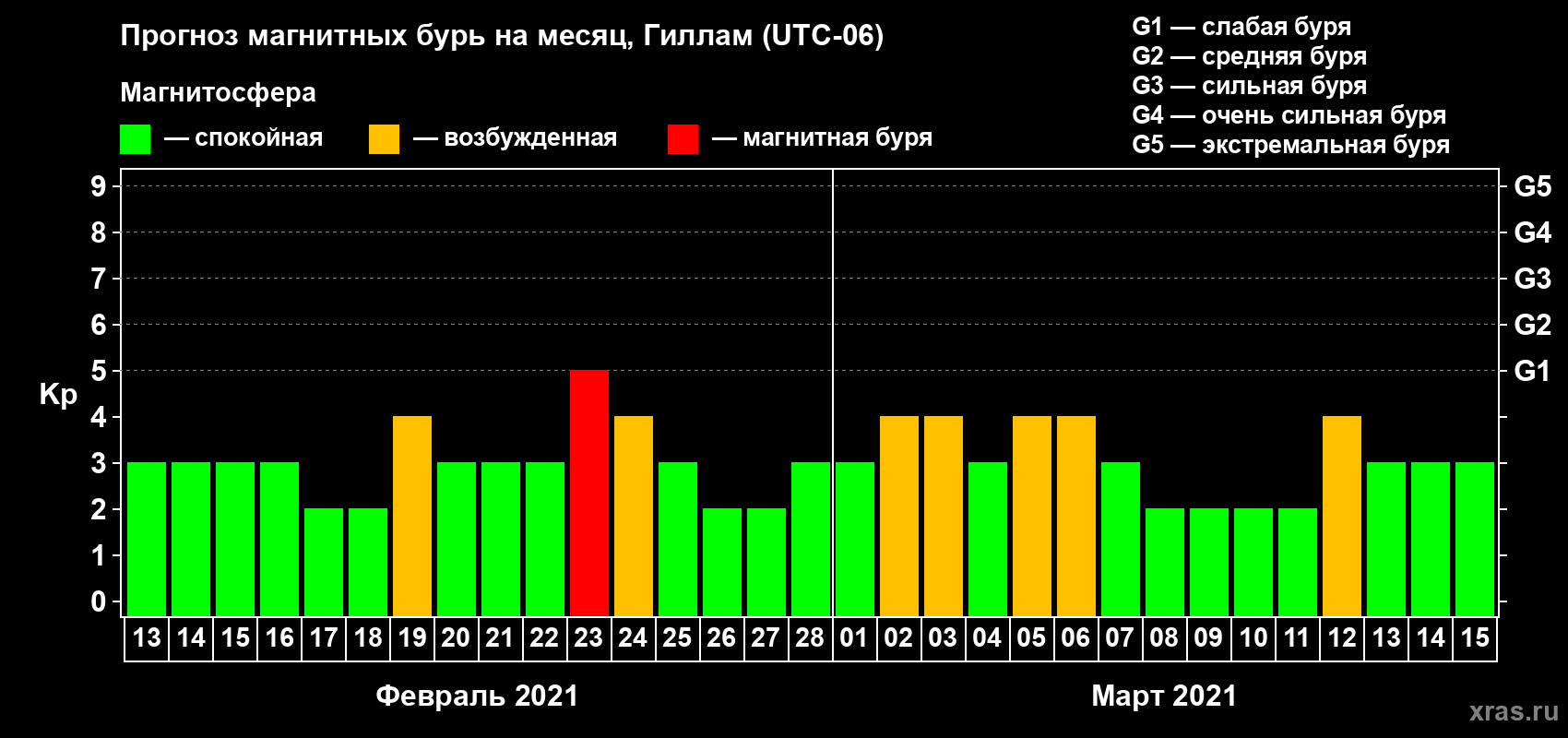 Прогноз магнитных бурь в Гилламе — 13 февраля 2021 года