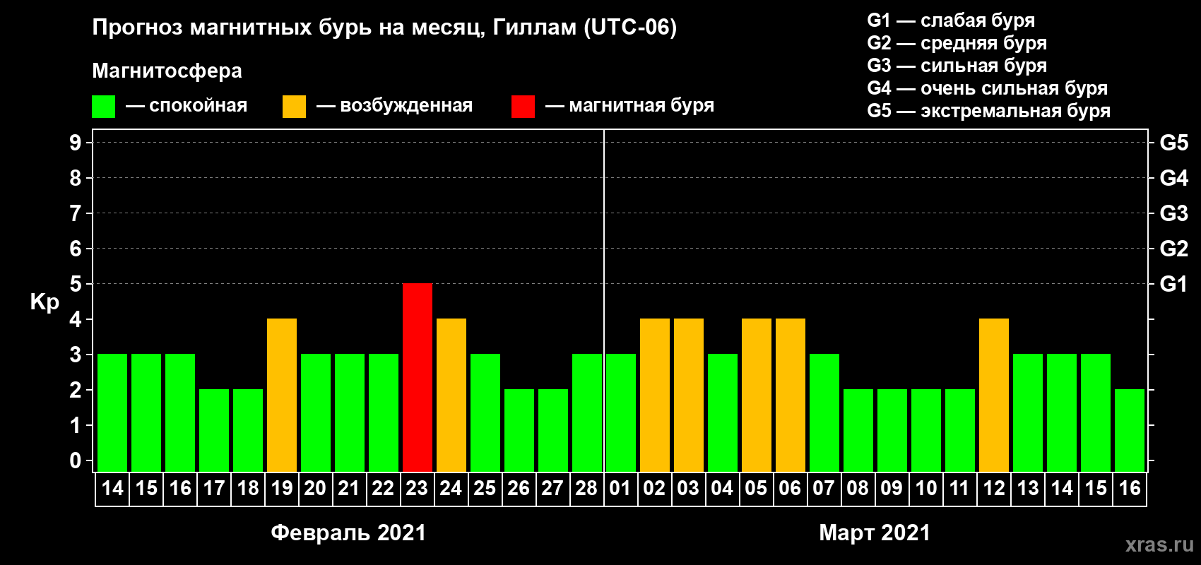 Прогноз магнитных бурь в Гилламе — 14 февраля 2021 года