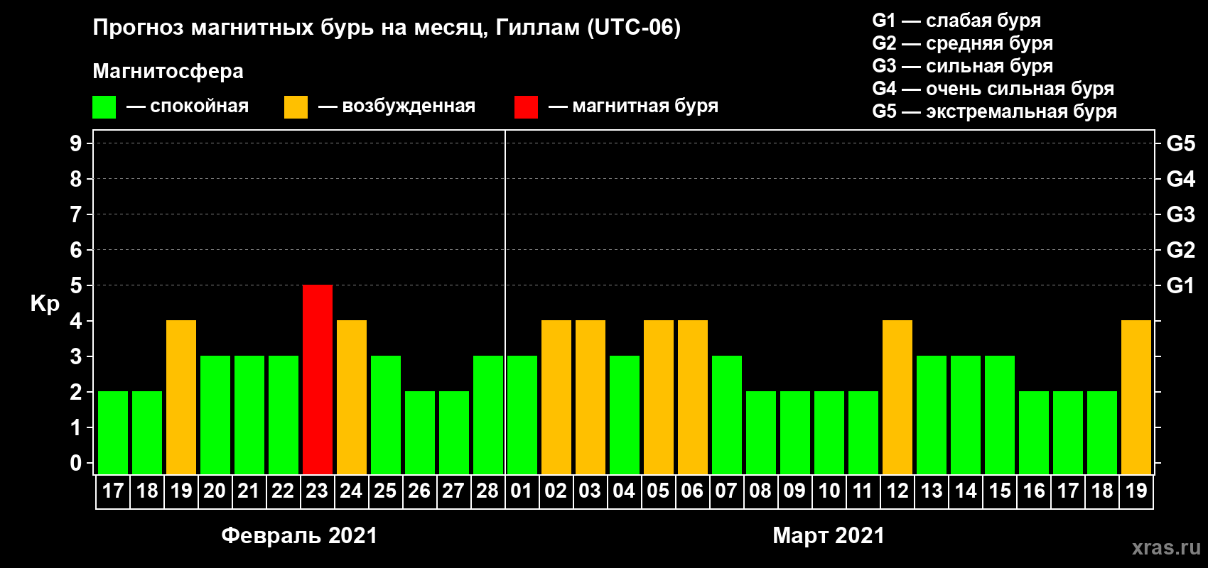 Прогноз магнитных бурь в Гилламе — 17 февраля 2021 года