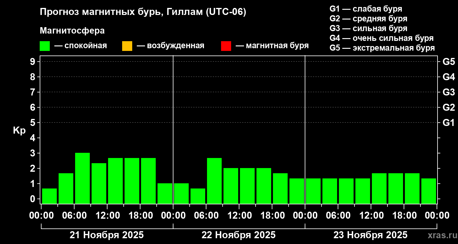 Прогноз магнитных бурь в Гилламе — 21 ноября 2025 года