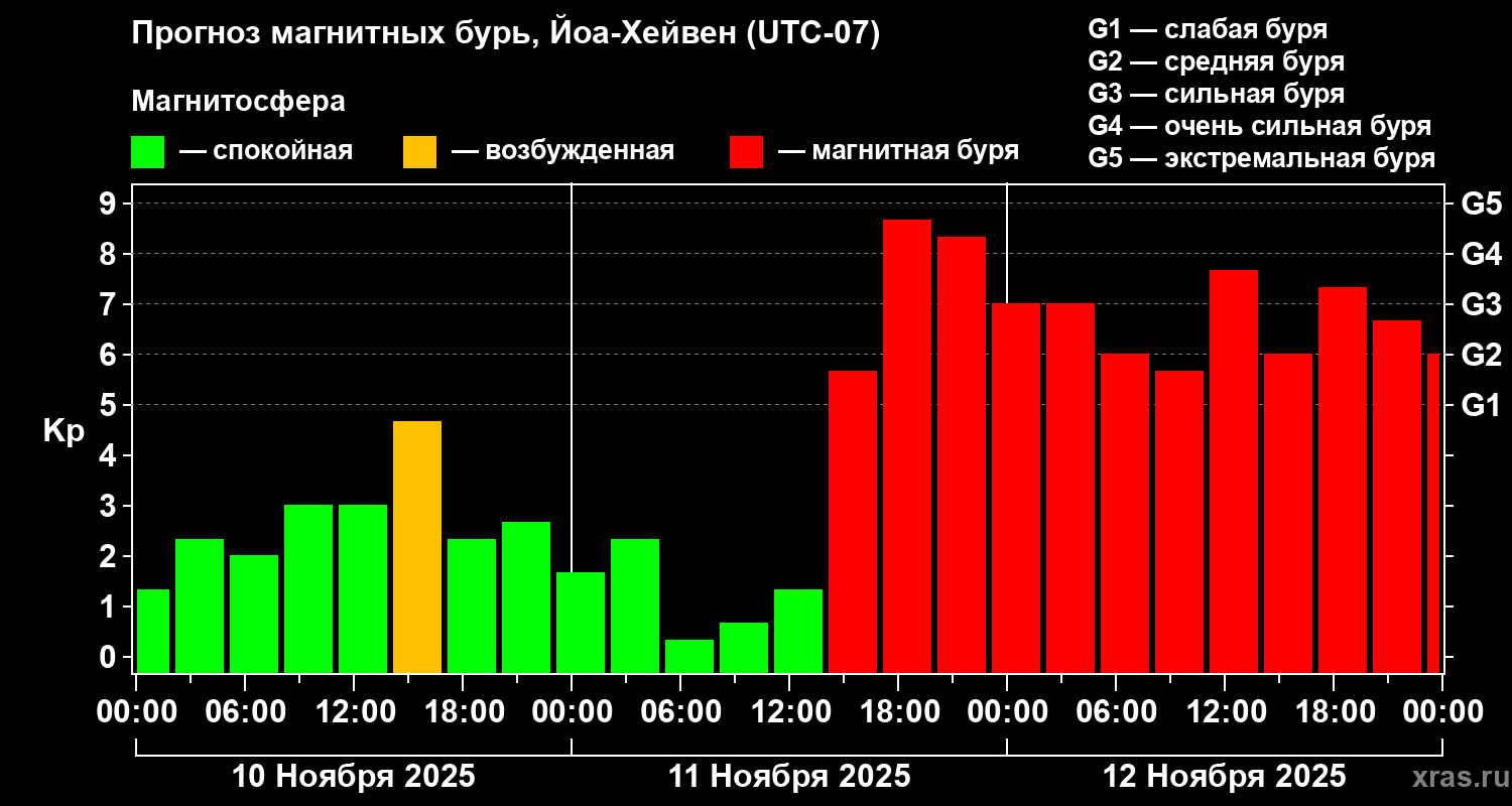 Прогноз магнитных бурь в Йоа-Хейвене — 10 ноября 2025 года