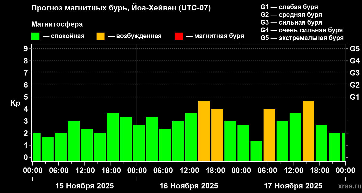 Прогноз магнитных бурь в Йоа-Хейвене — 15 ноября 2025 года