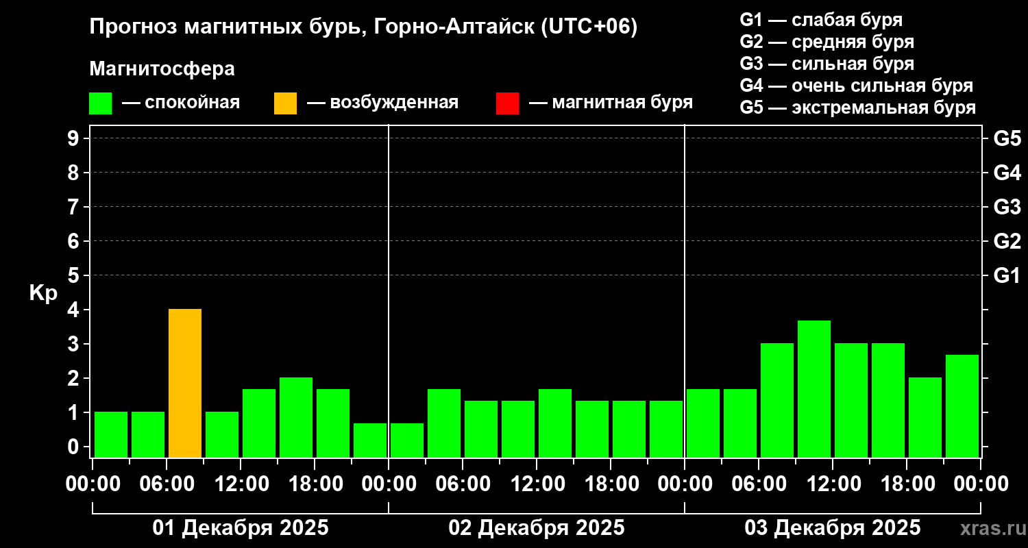 Прогноз магнитных бурь в Горно-Алтайске — 1 декабря 2025 года