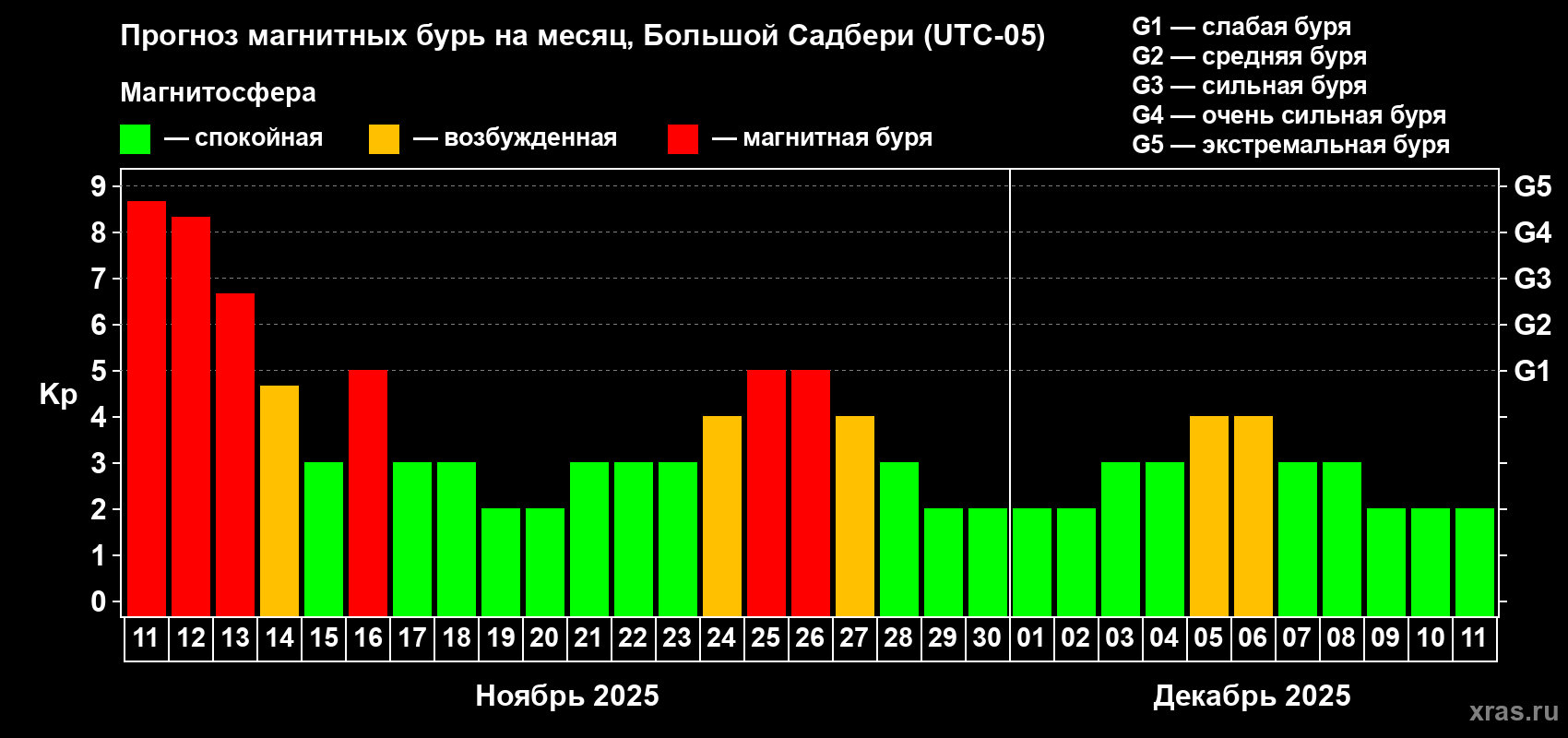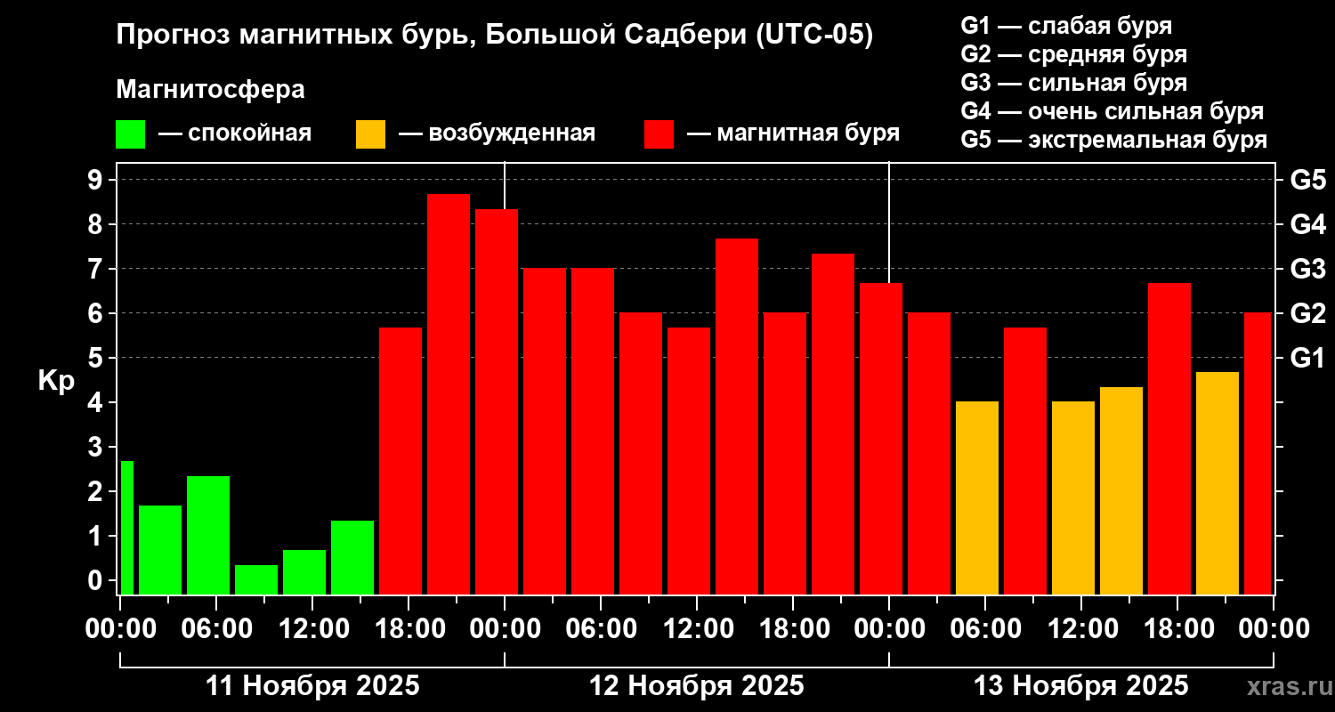 Прогноз магнитных бурь Большом Садбери — 11 ноября 2025 года