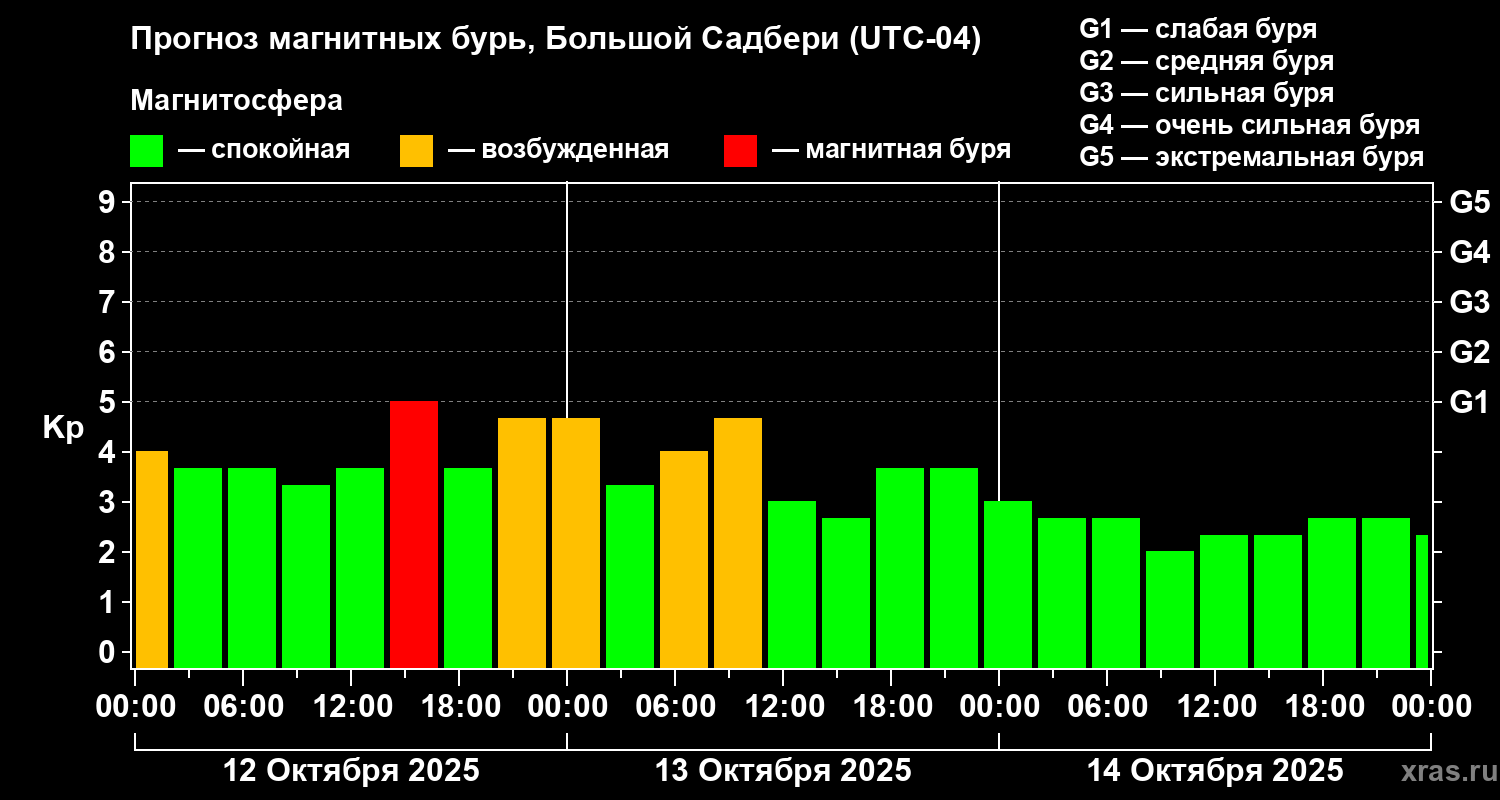 Прогноз магнитных бурь Большом Садбери на 12 октября 2025 года