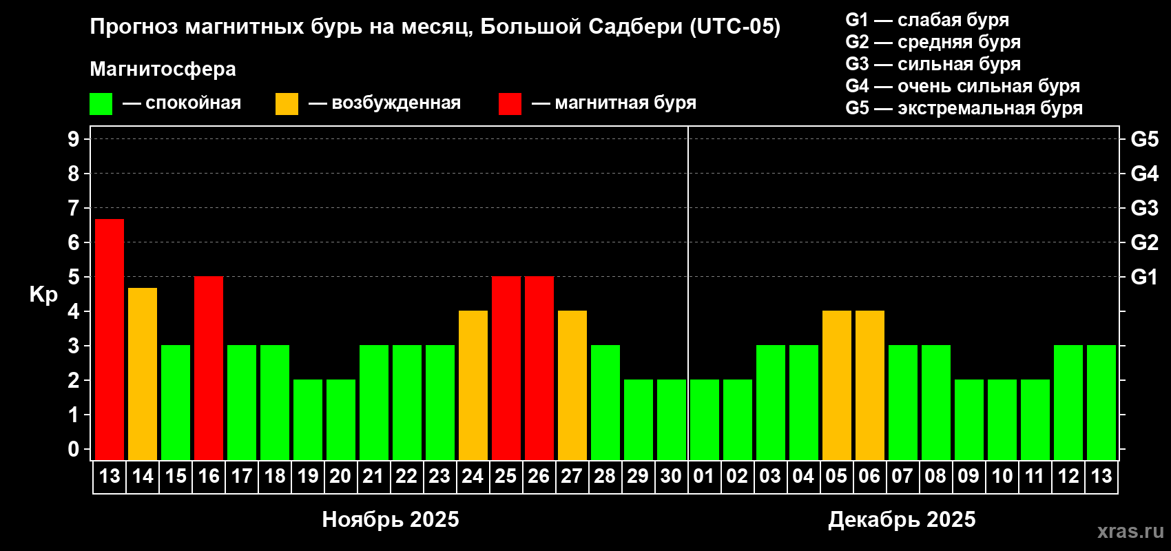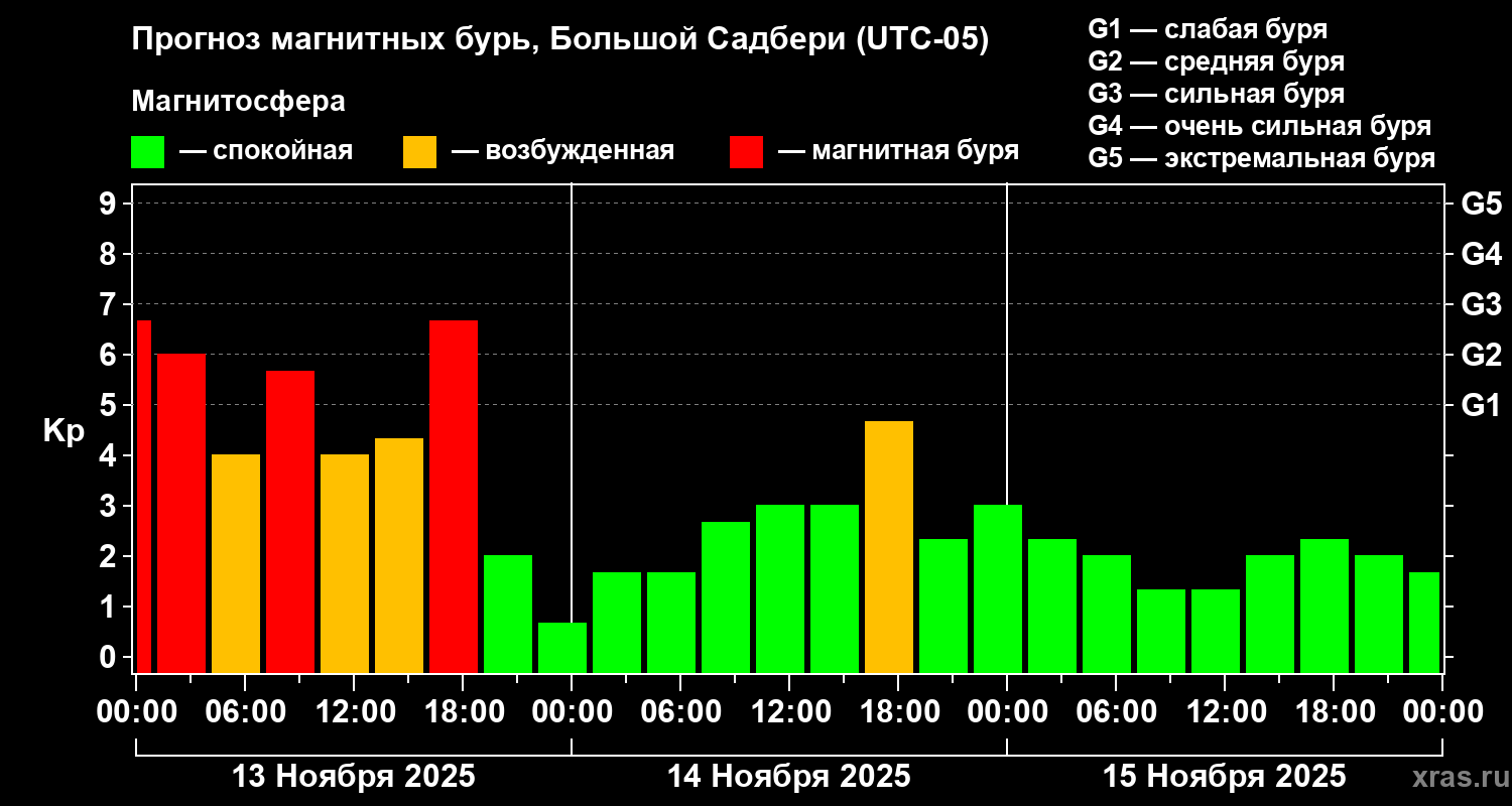 Прогноз магнитных бурь Большом Садбери — 13 ноября 2025 года