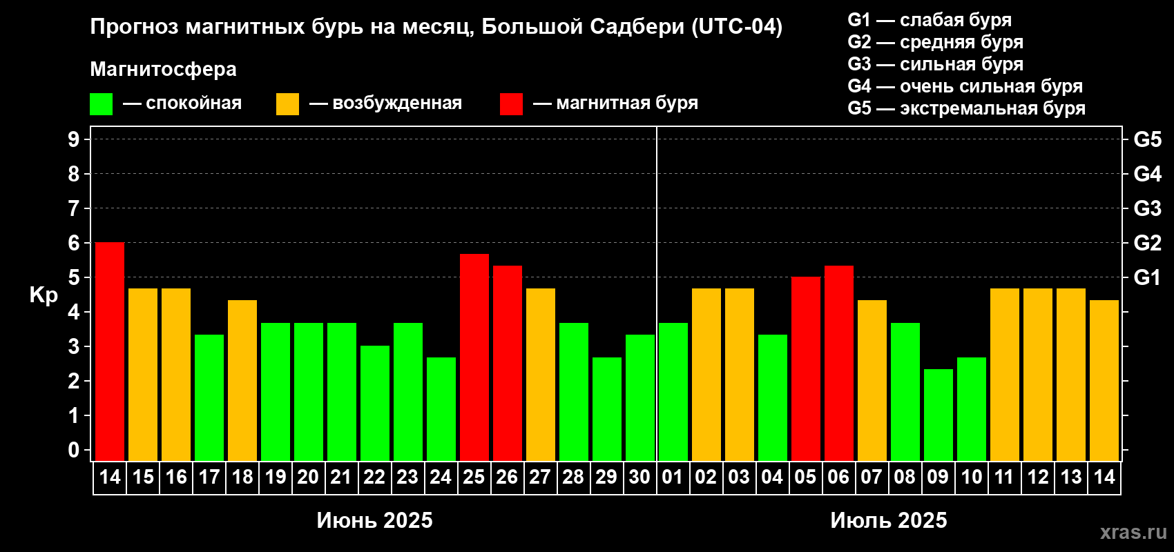 Прогноз магнитных бурь Большом Садбери на 14 июня 2025 года