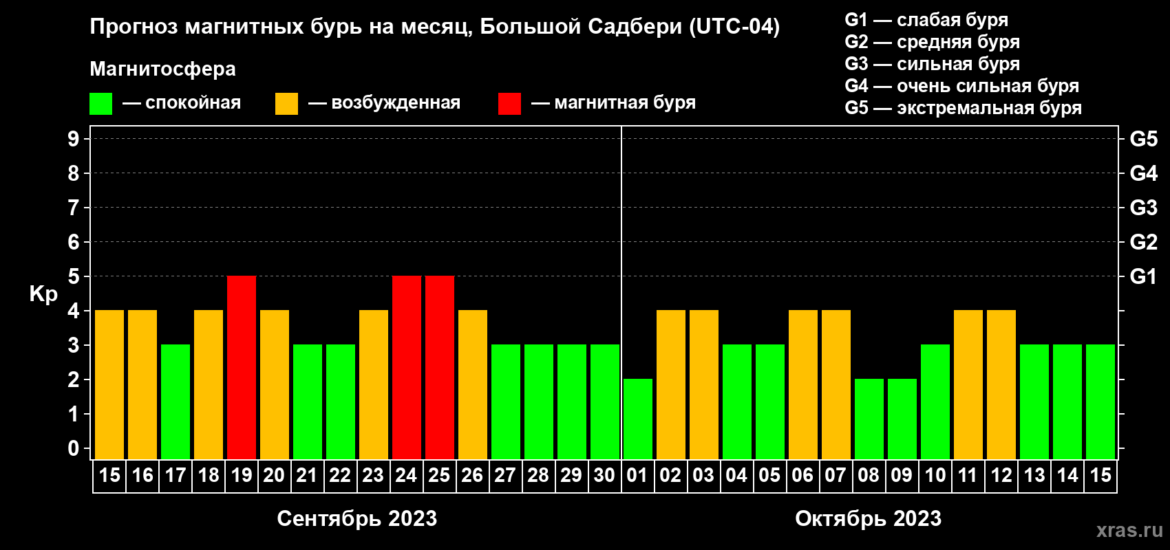 Прогноз магнитных бурь Большом Садбери — 15 сентября 2023 года