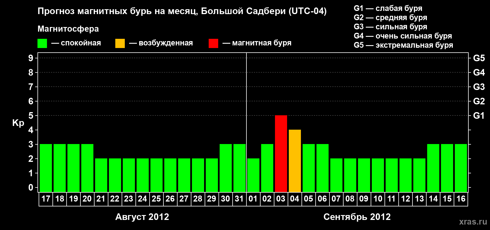 Прогноз магнитных бурь Большом Садбери — 17 августа 2012 года