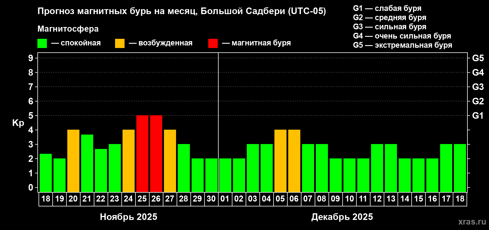 Прогноз магнитных бурь Большом Садбери — 18 ноября 2025 года
