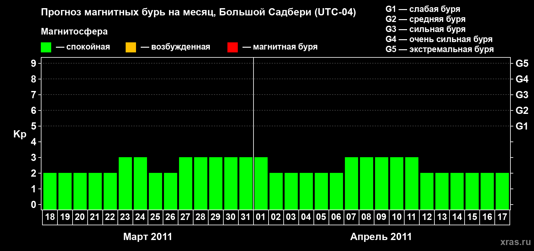 Прогноз магнитных бурь Большом Садбери — 18 марта 2011 года
