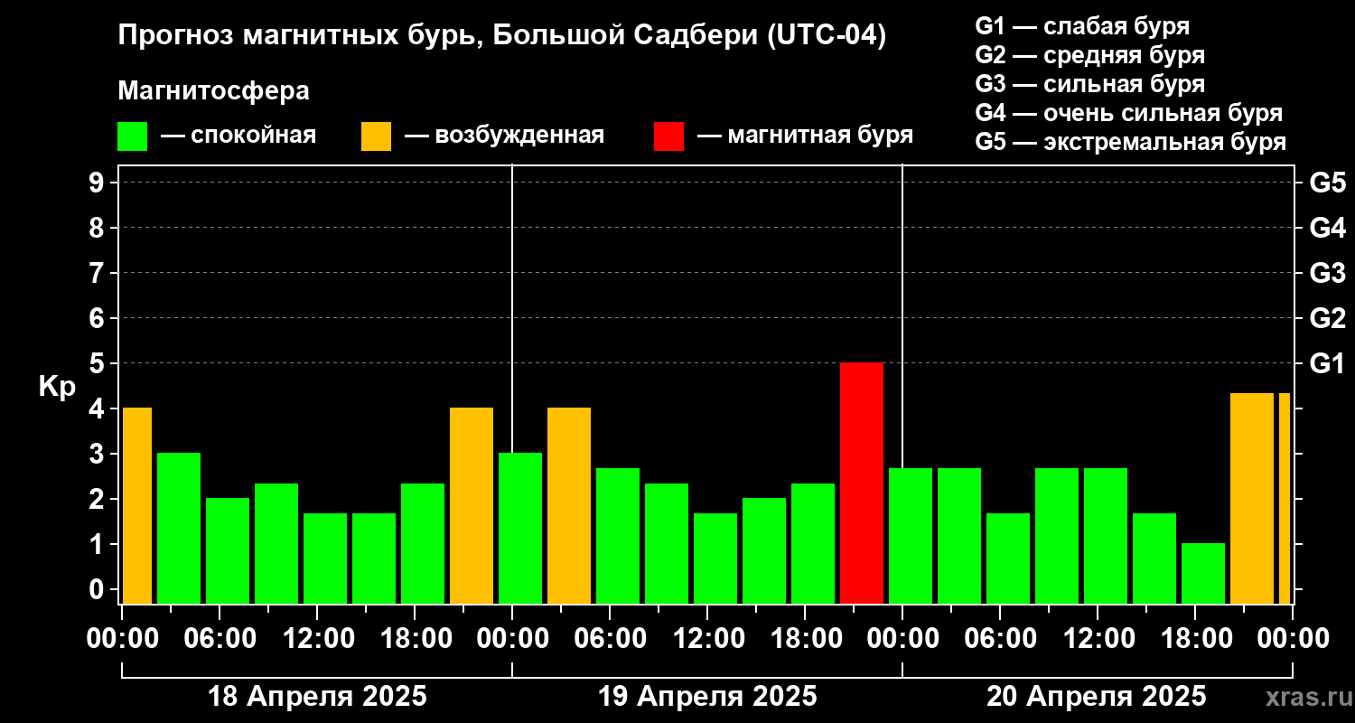 Прогноз магнитных бурь Большом Садбери — 18 апреля 2025 года