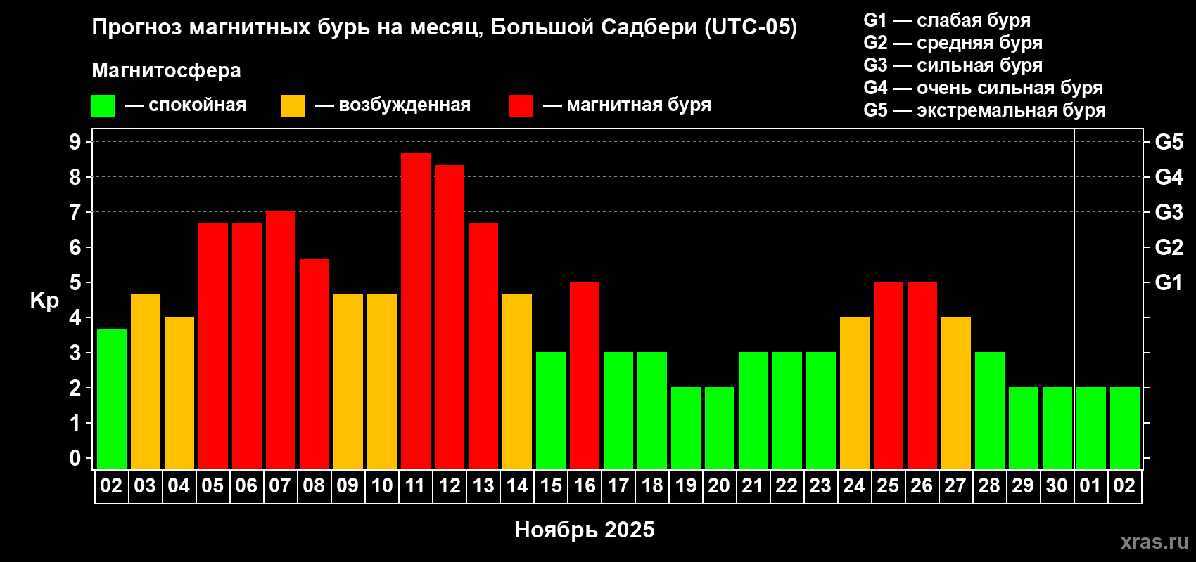 Прогноз магнитных бурь Большом Садбери — 2 ноября 2025 года