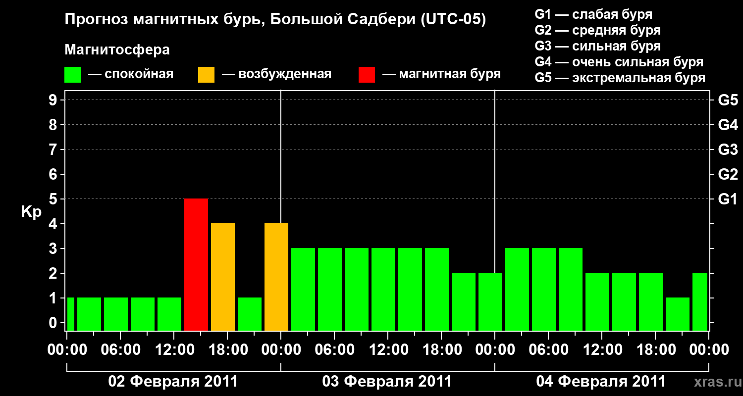 Прогноз магнитных бурь Большом Садбери — 2 февраля 2011 года
