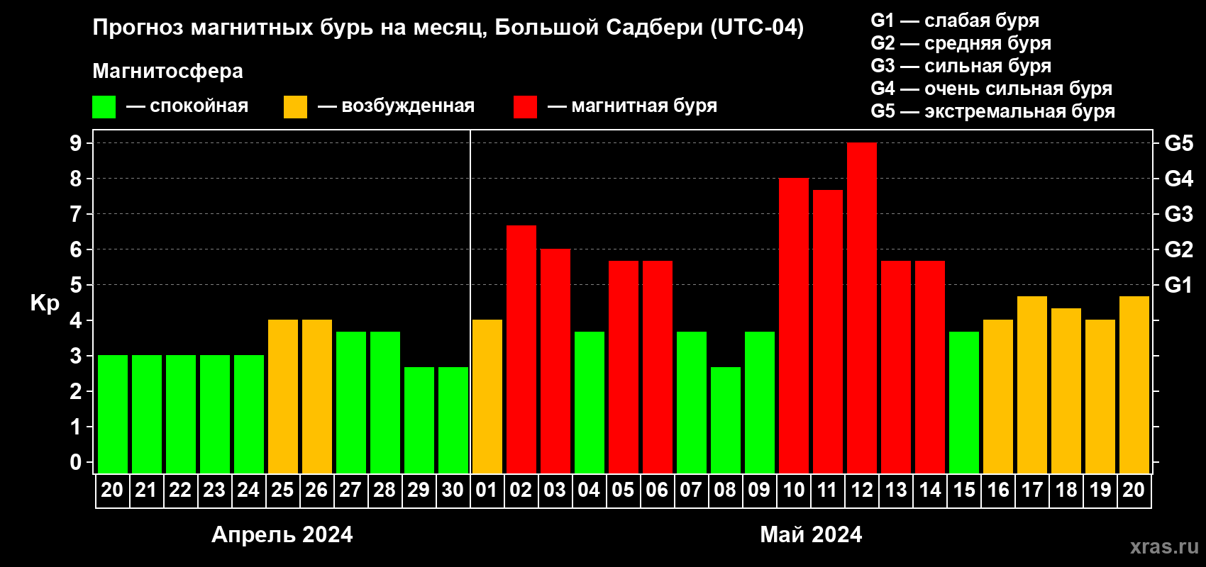 Прогноз магнитных бурь Большом Садбери на 20 апреля 2024 года