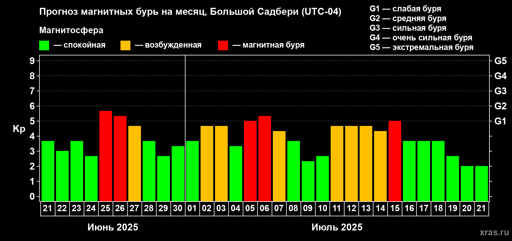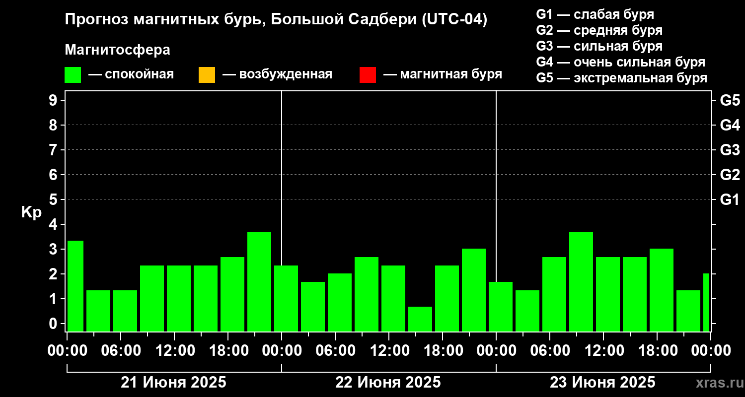 Прогноз магнитных бурь Большом Садбери — 21 июня 2025 года