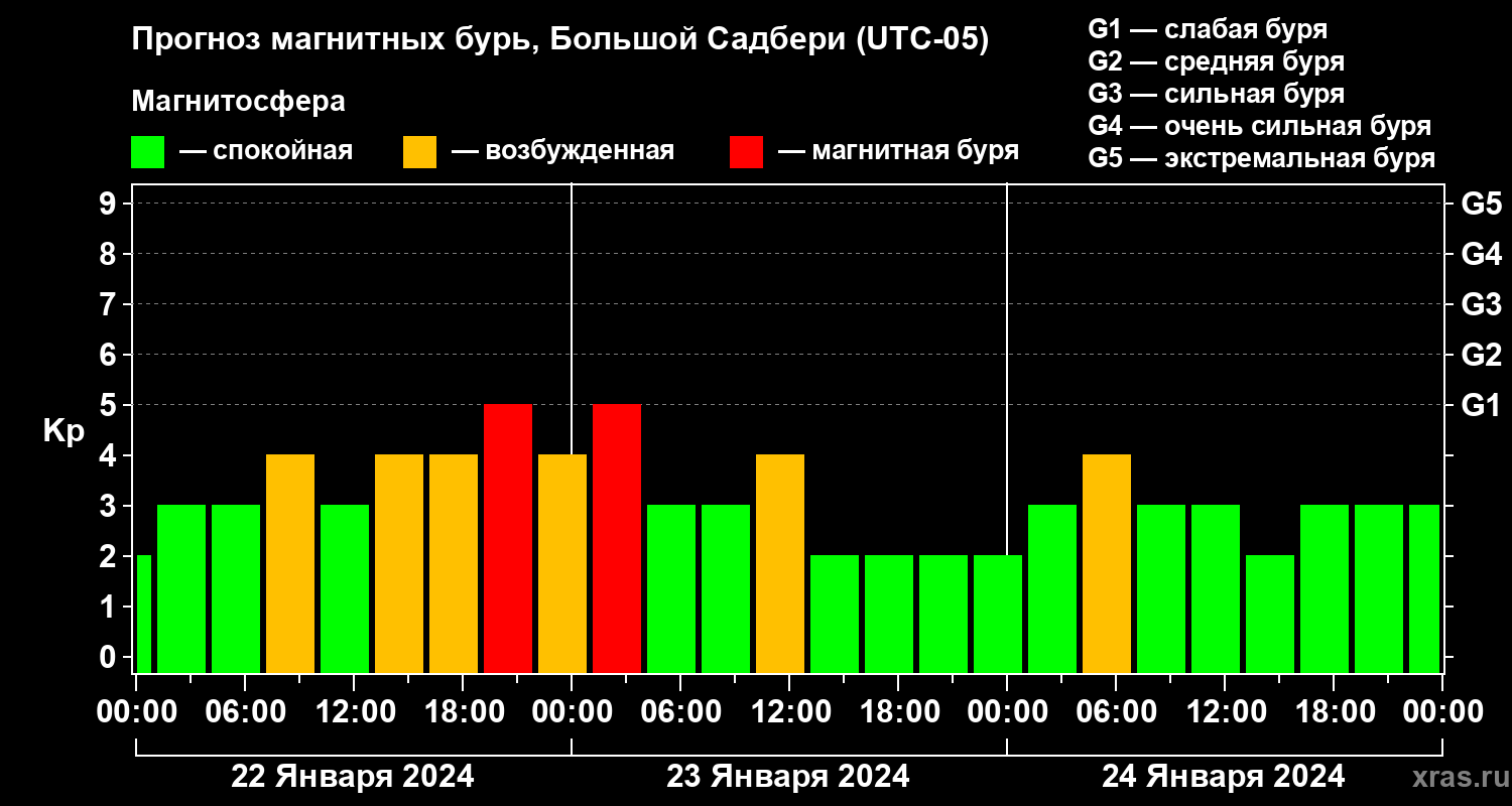 Прогноз магнитных бурь Большом Садбери на 22 января 2024 года