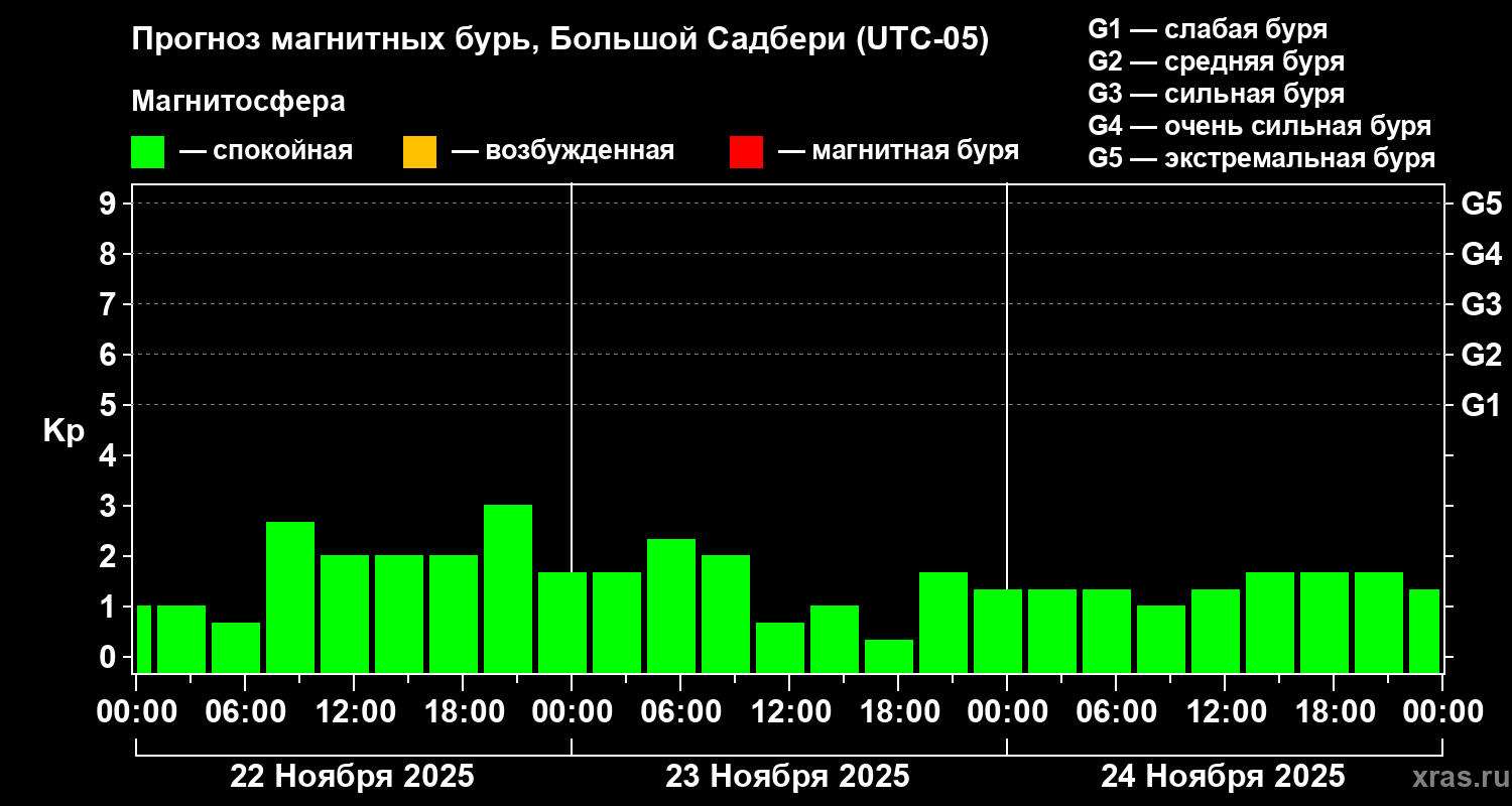 Прогноз магнитных бурь Большом Садбери — 22 ноября 2025 года
