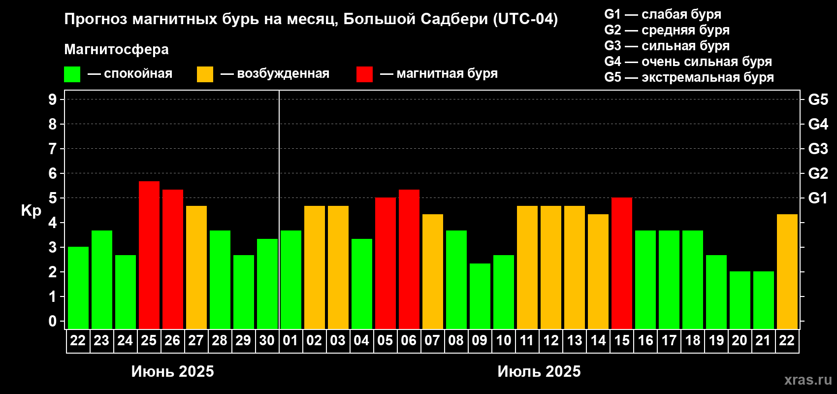Прогноз магнитных бурь Большом Садбери — 22 июня 2025 года