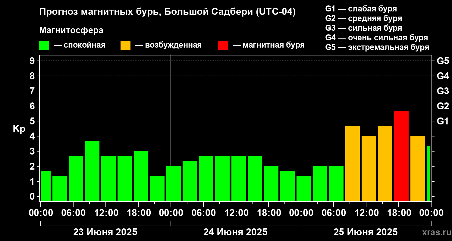 Прогноз магнитных бурь Большом Садбери — 23 июня 2025 года