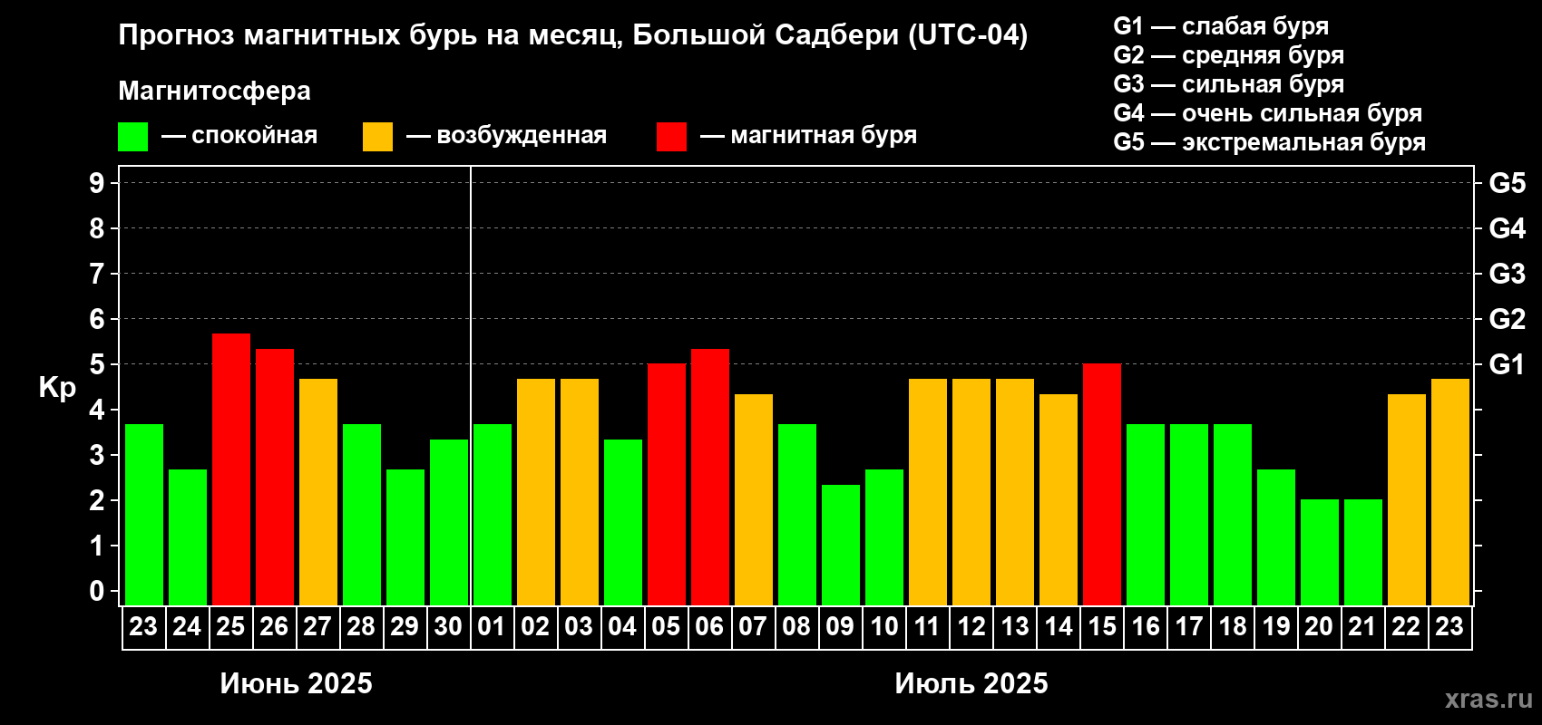 Прогноз магнитных бурь Большом Садбери на 23 июня 2025 года