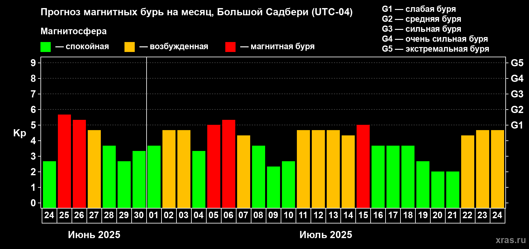 Прогноз магнитных бурь Большом Садбери — 24 июня 2025 года