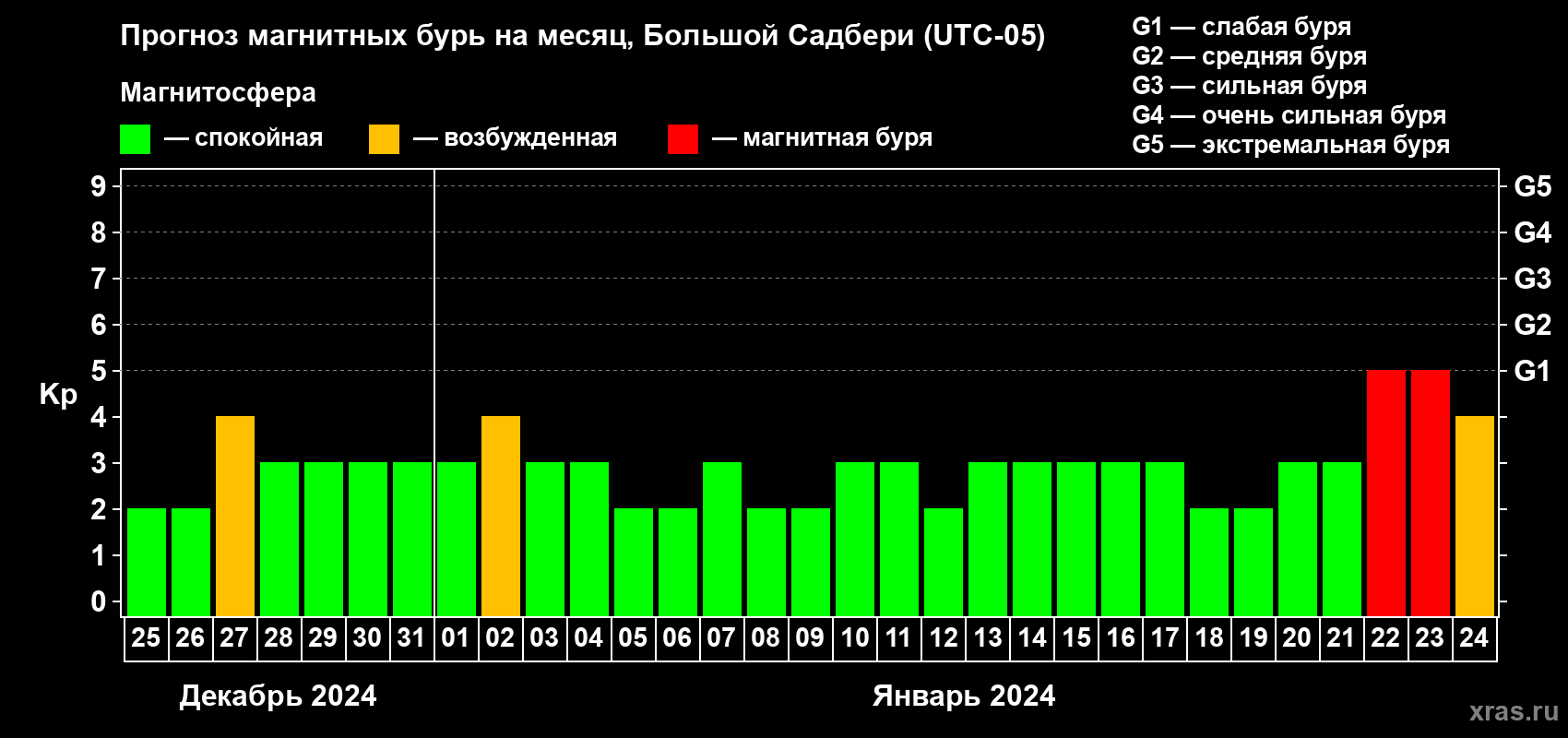 Прогноз магнитных бурь Большом Садбери — 25 декабря 2023 года