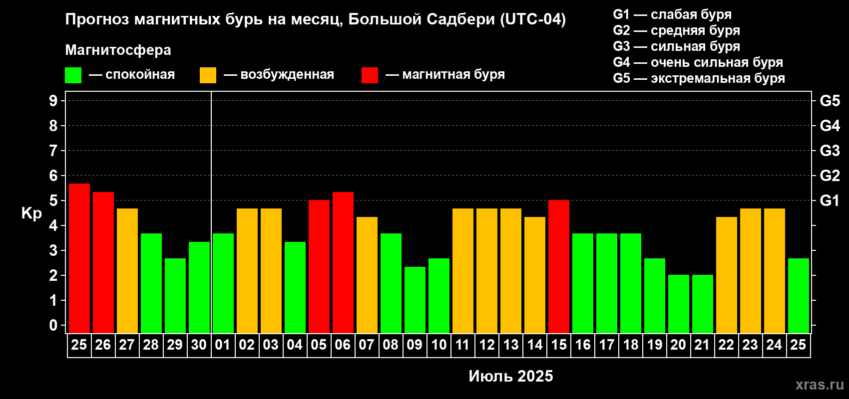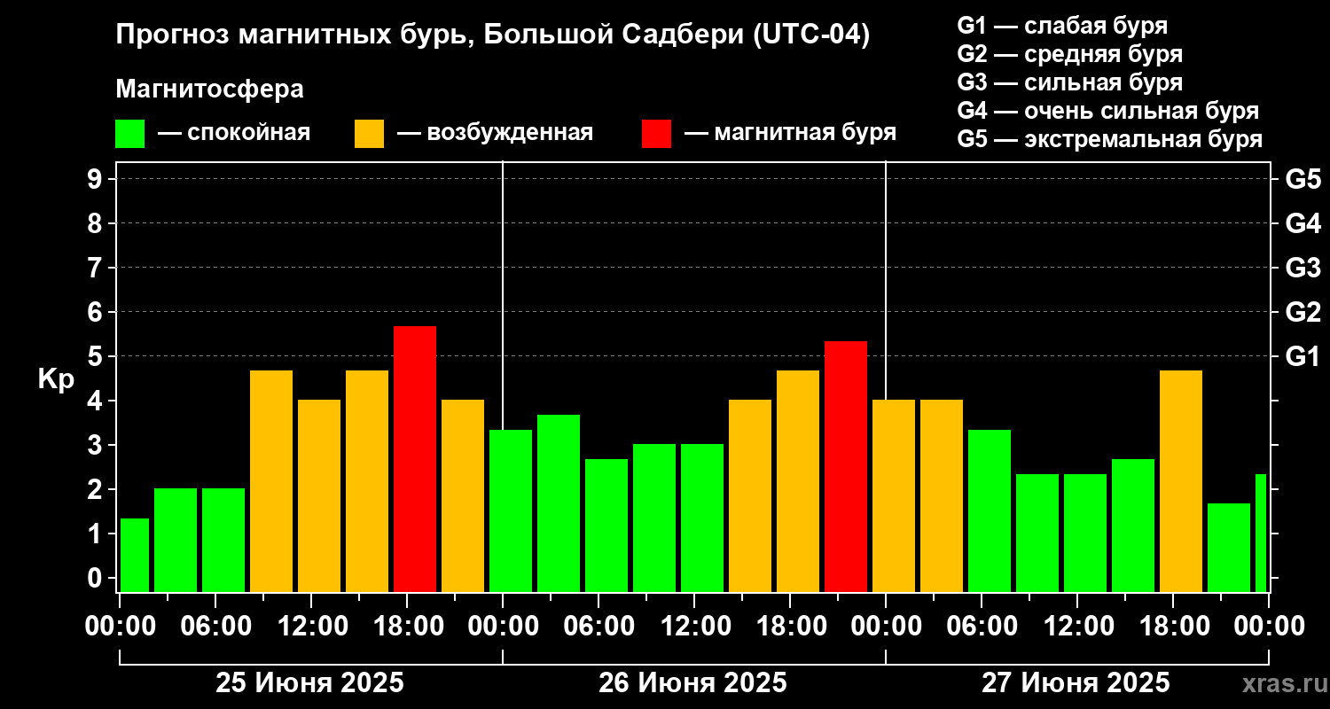 Прогноз магнитных бурь Большом Садбери — 25 июня 2025 года