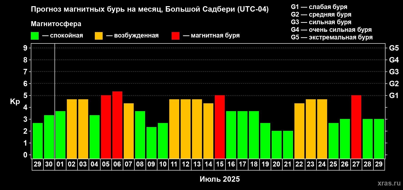 Прогноз магнитных бурь Большом Садбери — 29 июня 2025 года