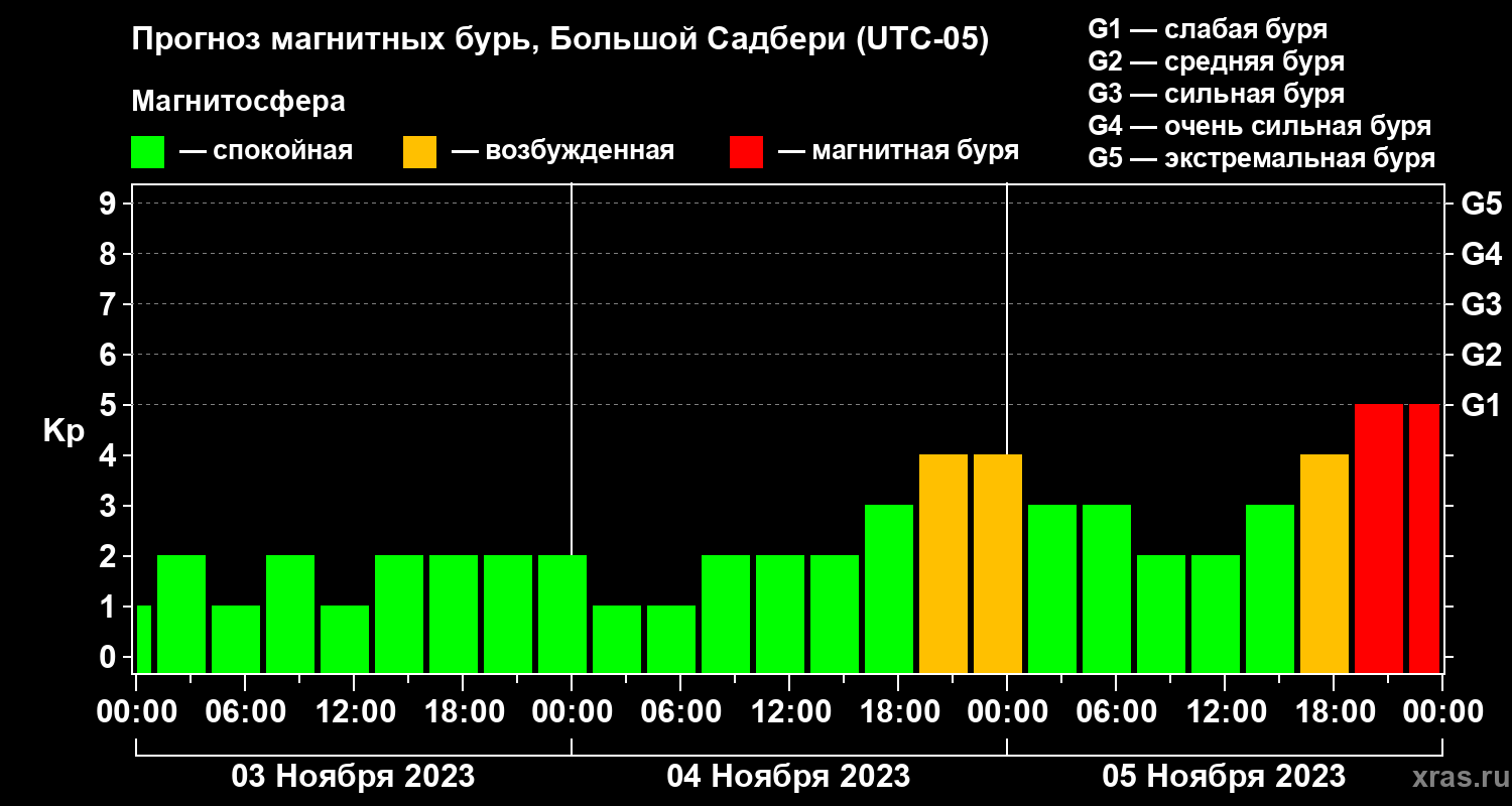 Прогноз магнитных бурь Большом Садбери — 3 ноября 2023 года