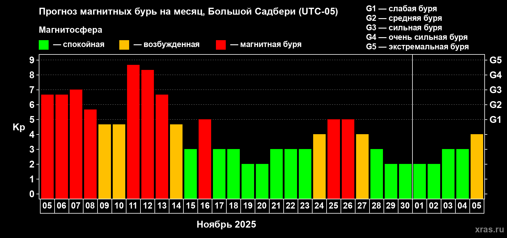 Прогноз магнитных бурь Большом Садбери — 5 ноября 2025 года