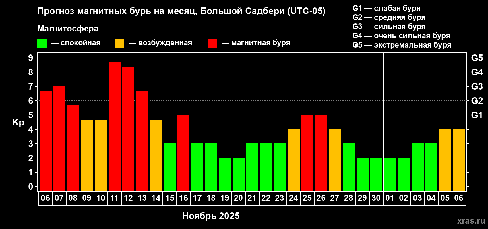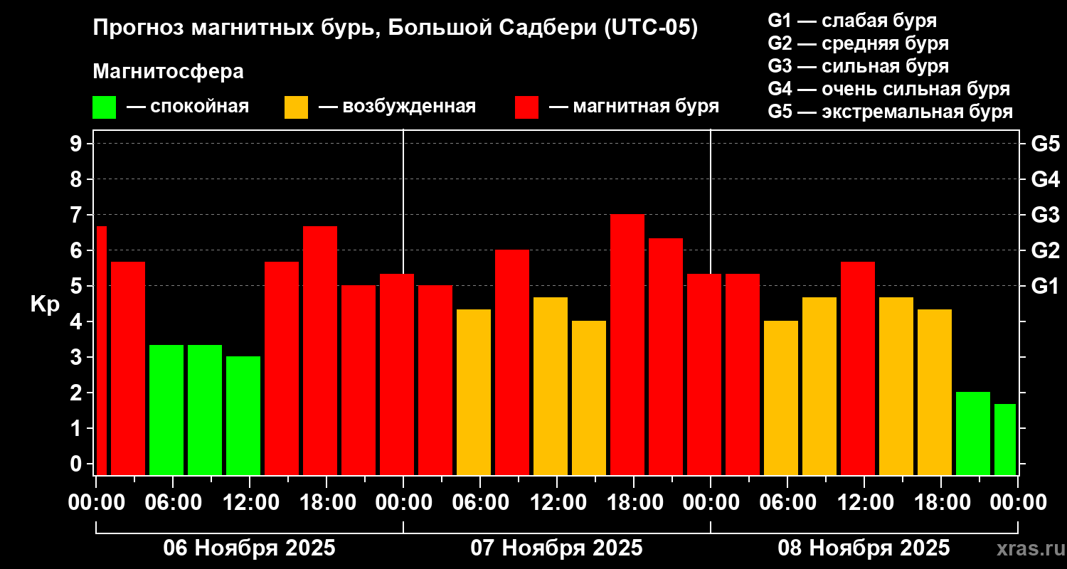 Прогноз магнитных бурь Большом Садбери — 6 ноября 2025 года