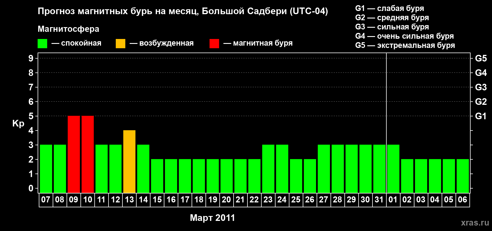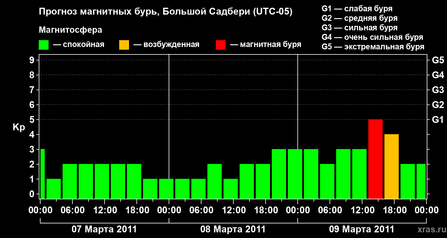 Прогноз магнитных бурь Большом Садбери — 7 марта 2011 года