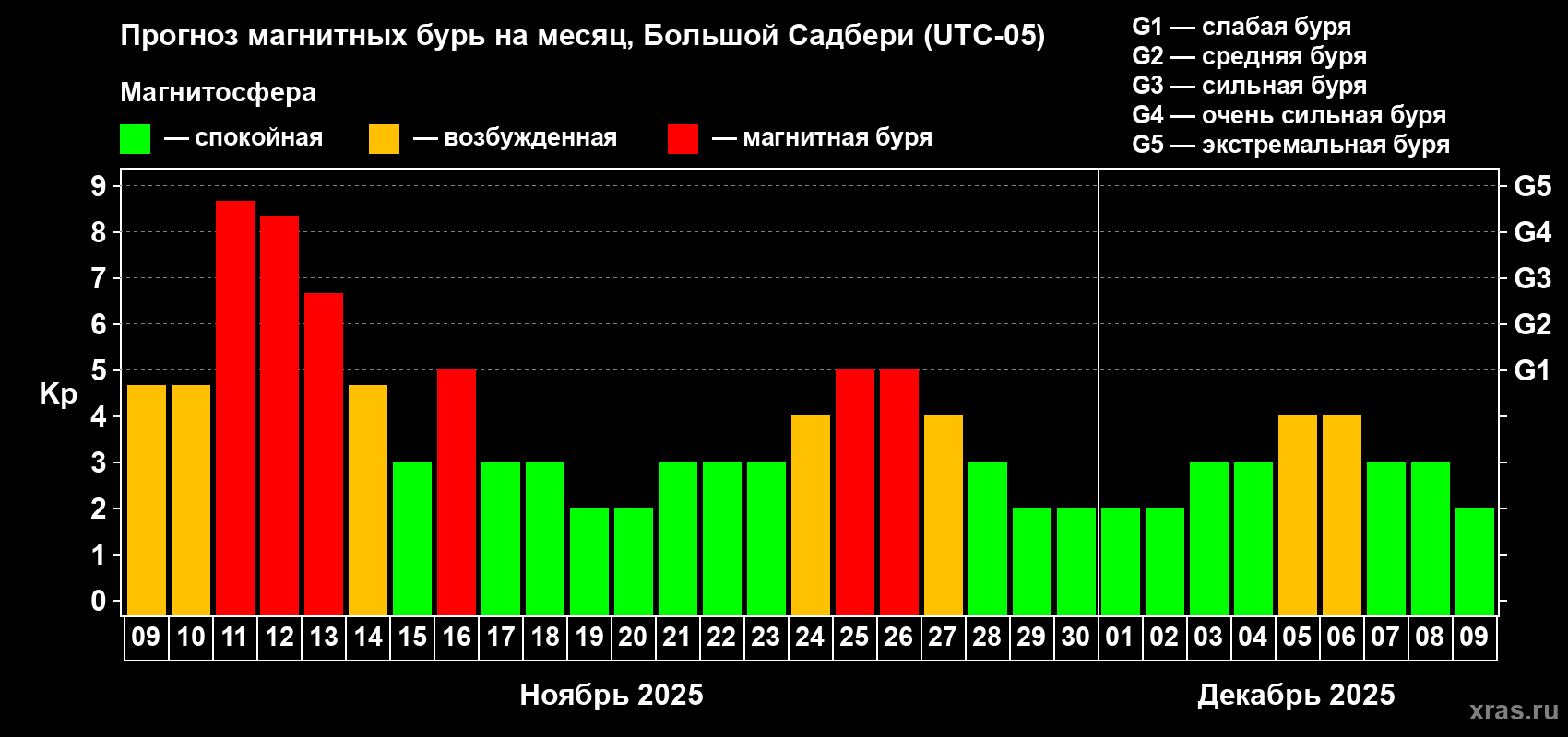 Прогноз магнитных бурь Большом Садбери — 9 ноября 2025 года