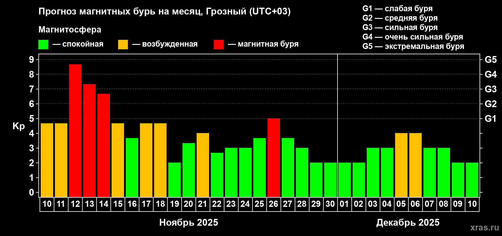 Прогноз магнитных бурь Грозном — 10 ноября 2025 года