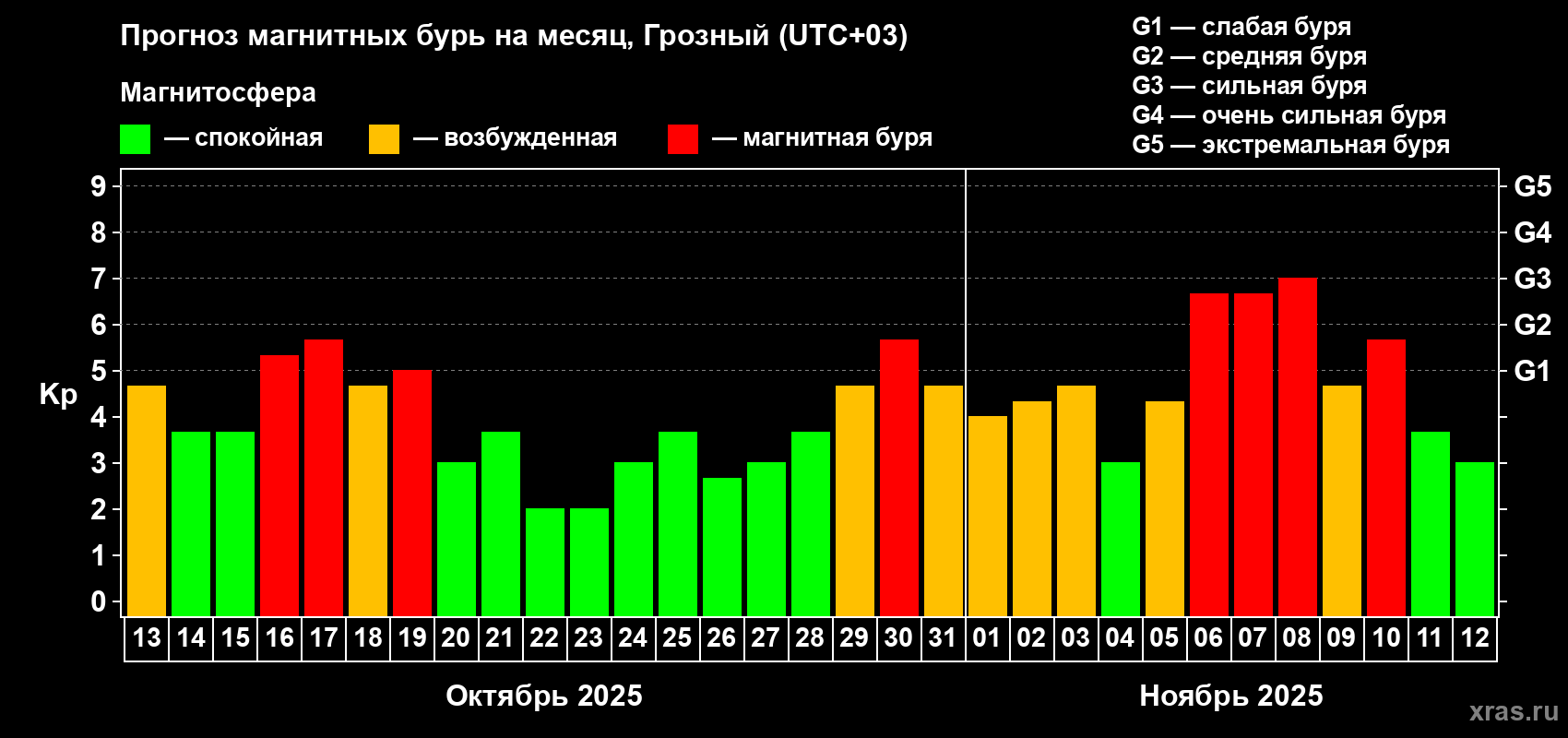 Прогноз магнитных бурь Грозном на 13 октября 2025 года