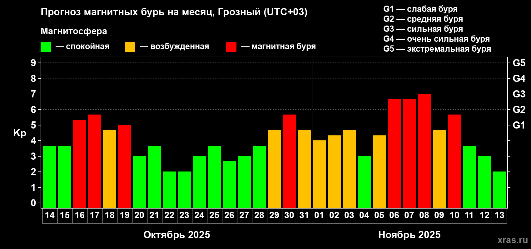 Прогноз магнитных бурь Грозном — 14 октября 2025 года