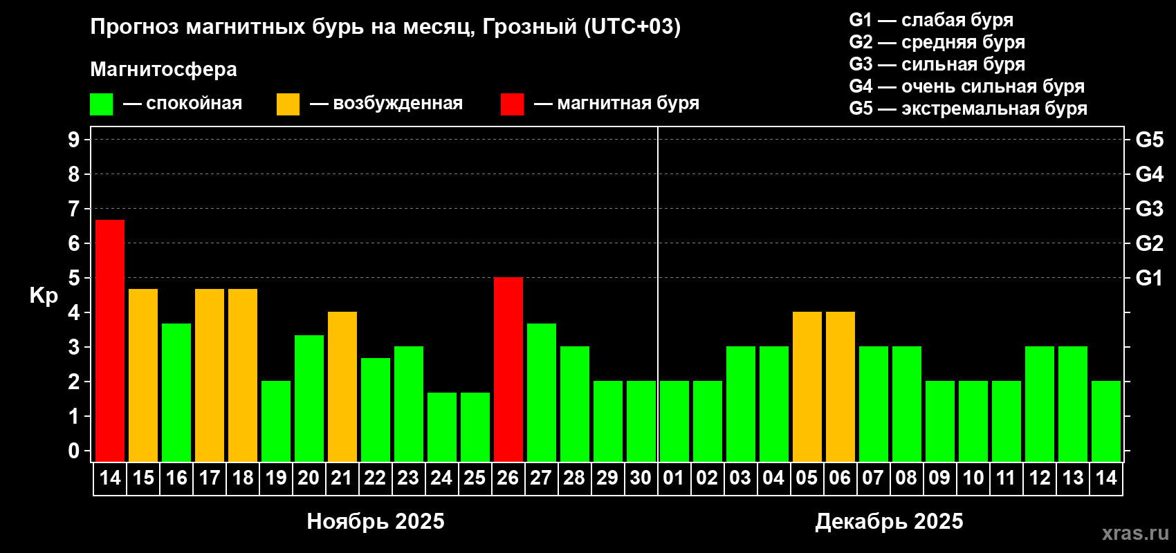 Прогноз магнитных бурь Грозном — 14 ноября 2025 года
