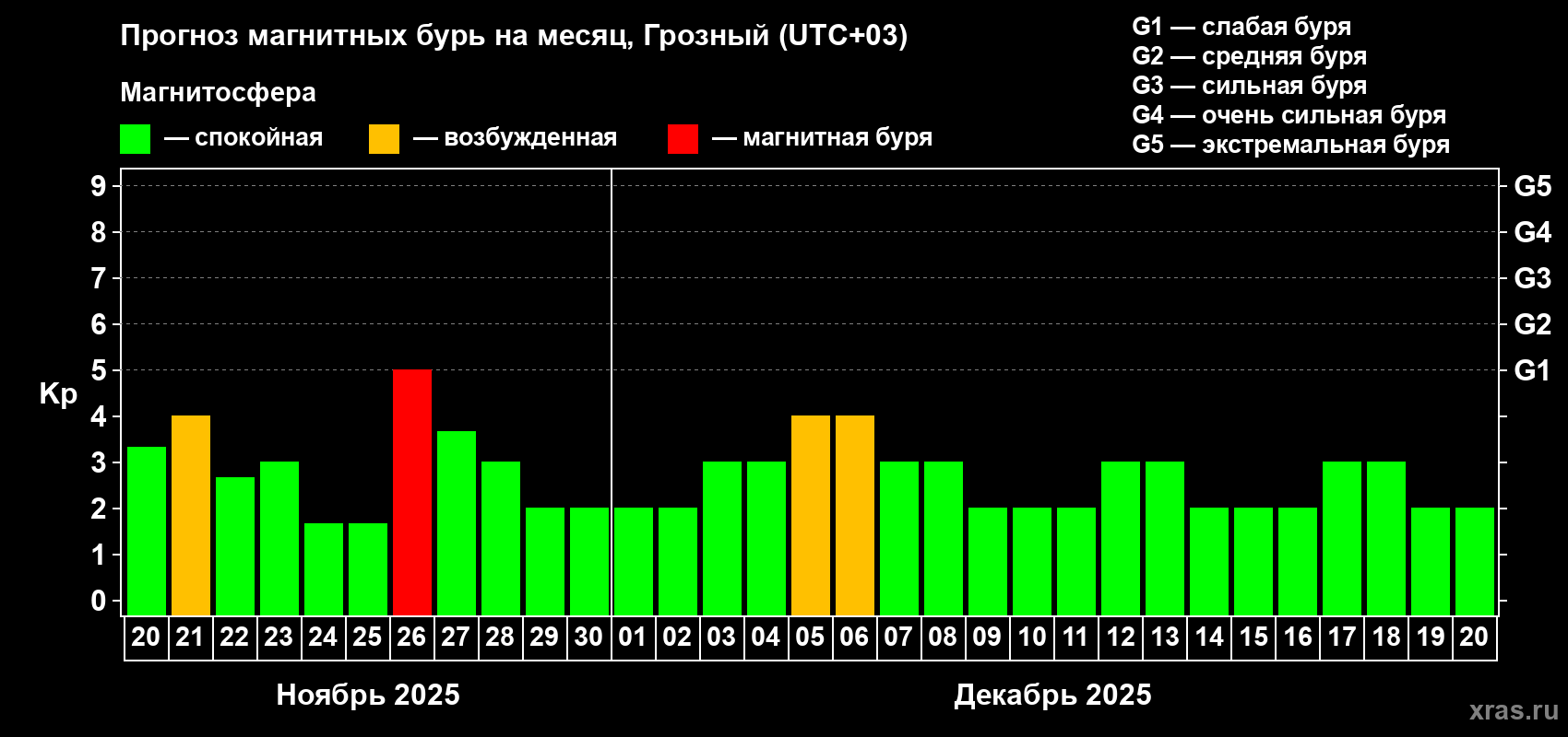 Прогноз магнитных бурь Грозном — 20 ноября 2025 года