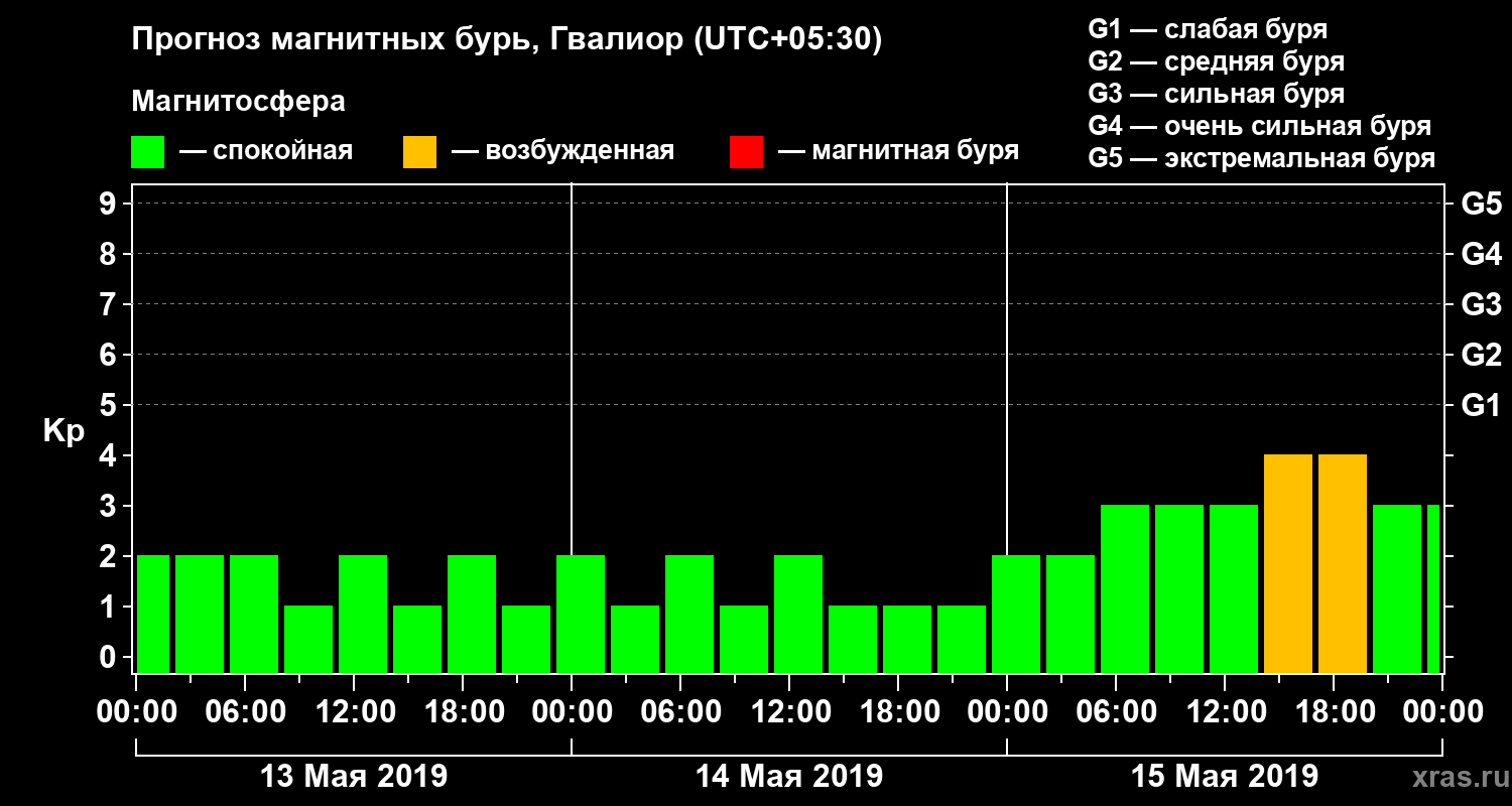 Прогноз магнитных бурь в Гвалиоре — 13 мая 2019 года