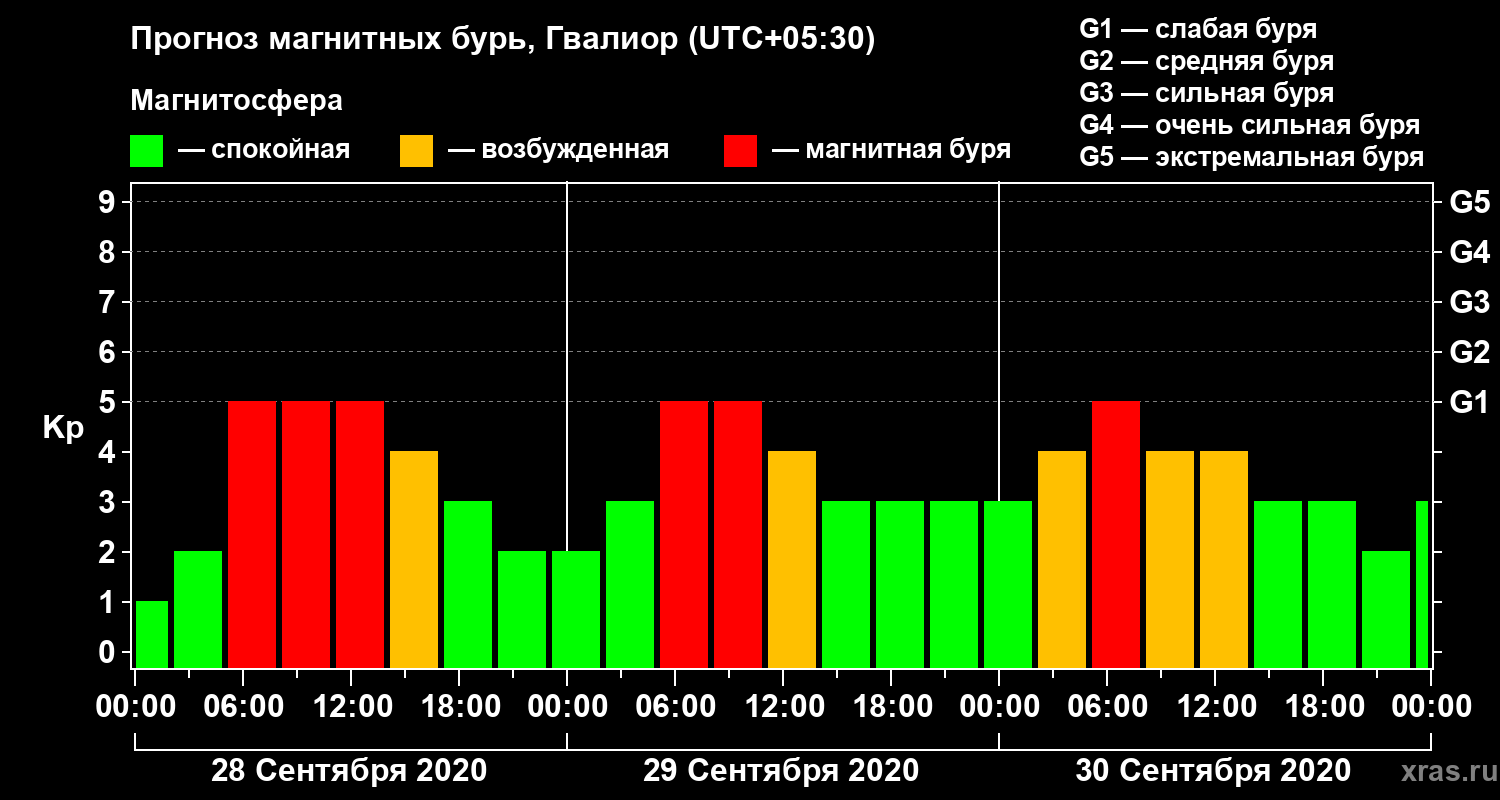 Прогноз магнитных бурь в Гвалиоре — 28 сентября 2020 года