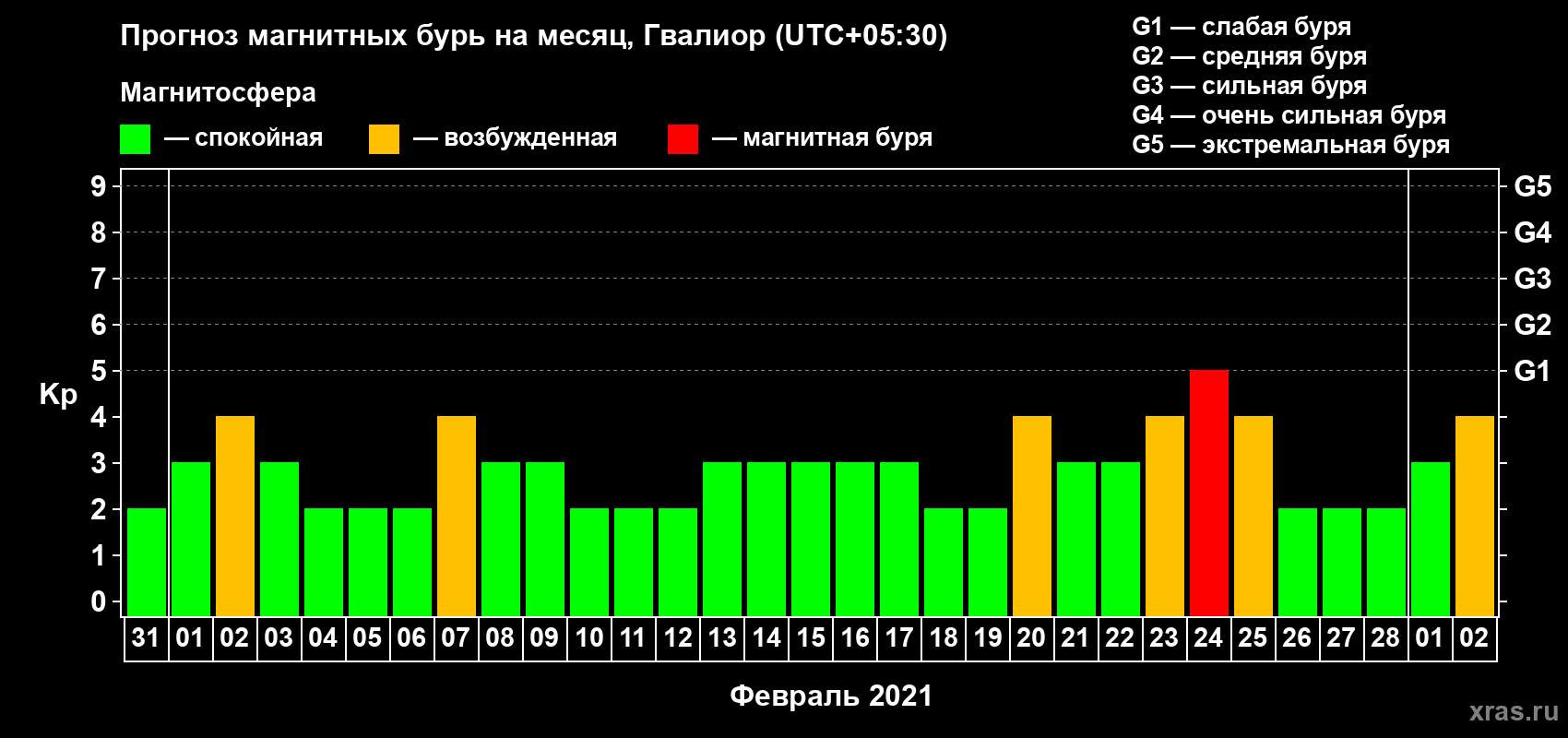 Прогноз магнитных бурь в Гвалиоре — 31 января 2021 года