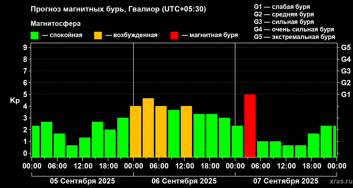 Прогноз магнитных бурь в Гвалиоре на 5 сентября 2025 года