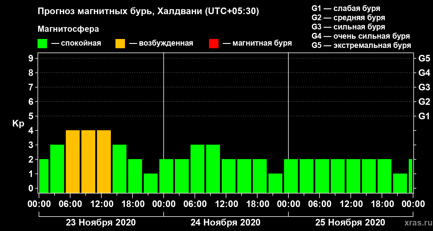 Прогноз магнитных бурь Халдвани на 23 ноября 2020 года