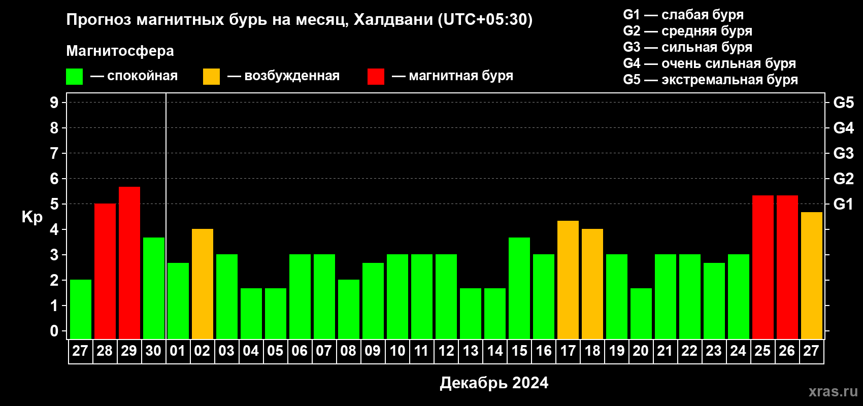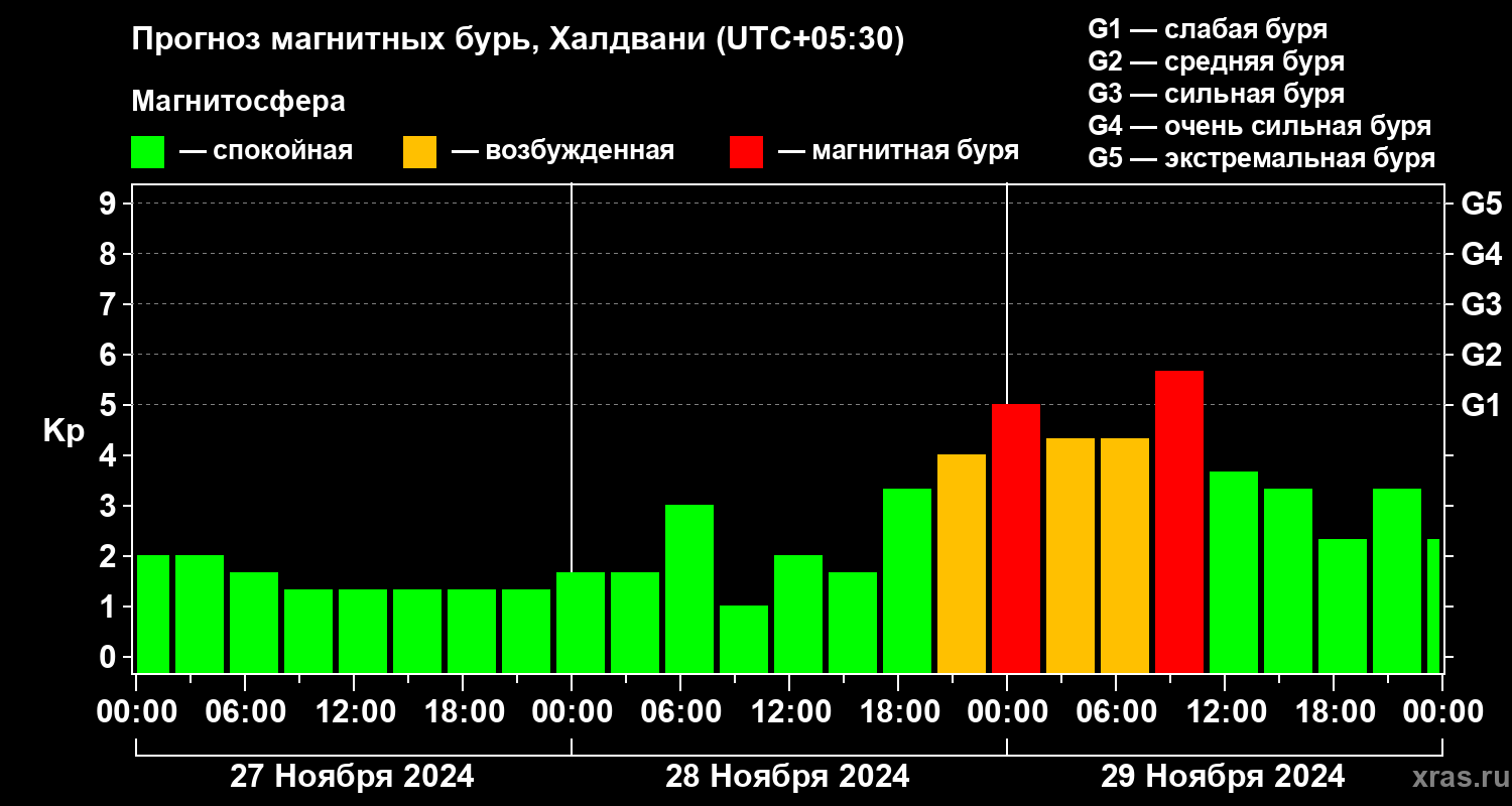 Прогноз магнитных бурь Халдвани на 27 ноября 2024 года