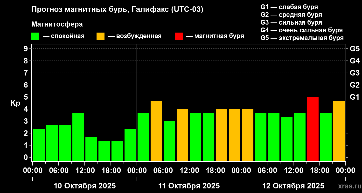 Прогноз магнитных бурь в Галифаксе на 10 октября 2025 года