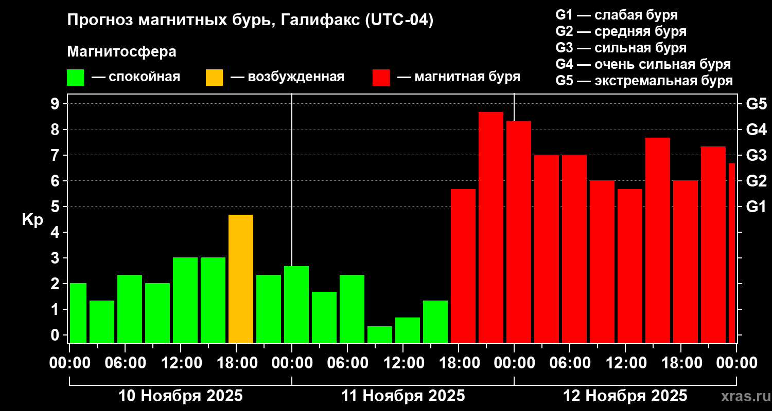 Прогноз магнитных бурь в Галифаксе — 10 ноября 2025 года