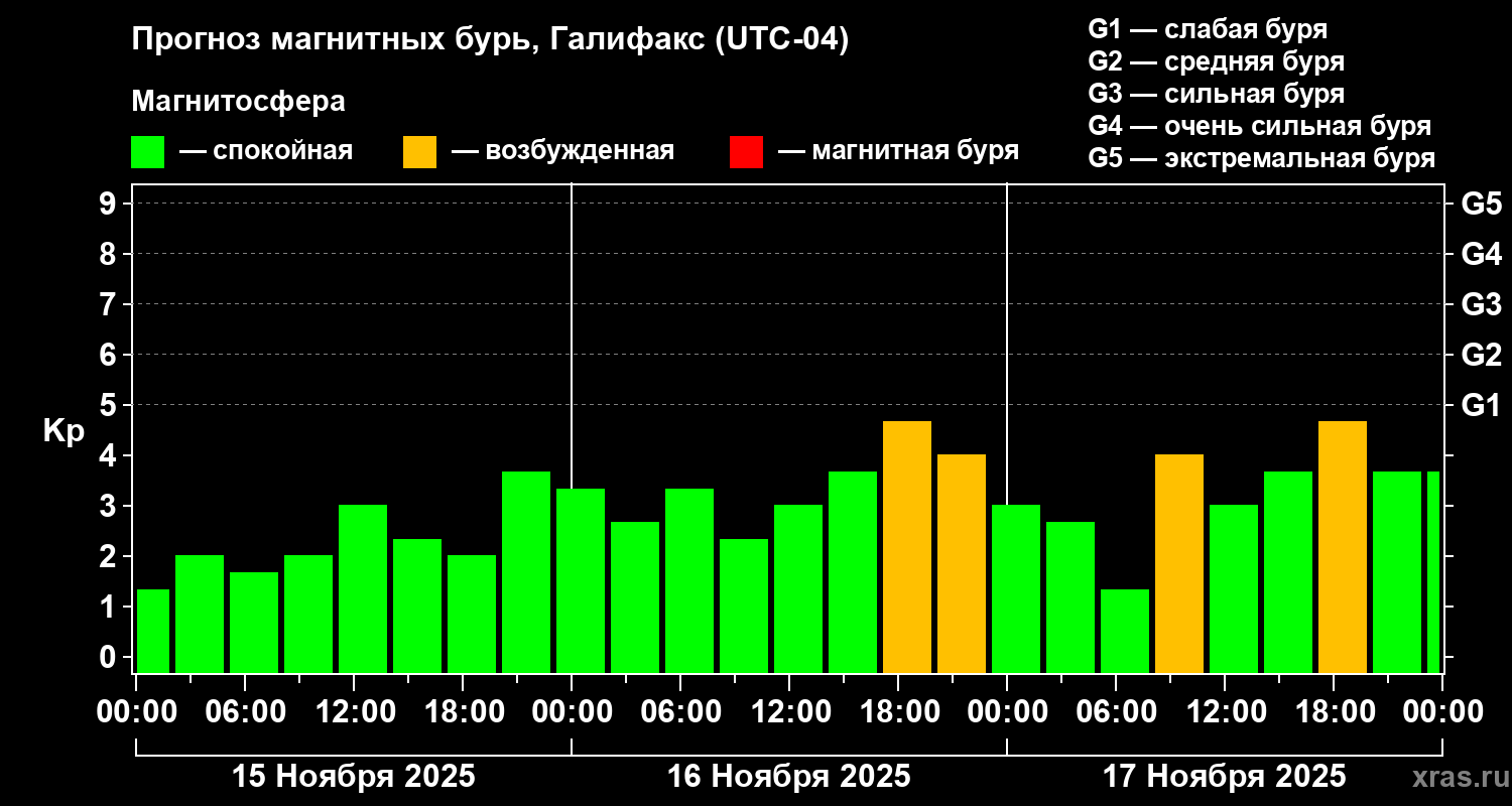 Прогноз магнитных бурь в Галифаксе — 15 ноября 2025 года