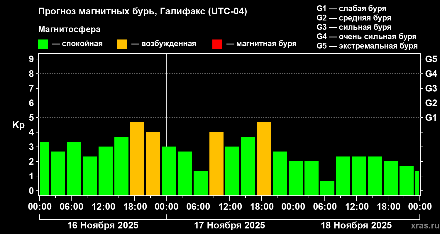 Прогноз магнитных бурь в Галифаксе — 16 ноября 2025 года